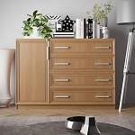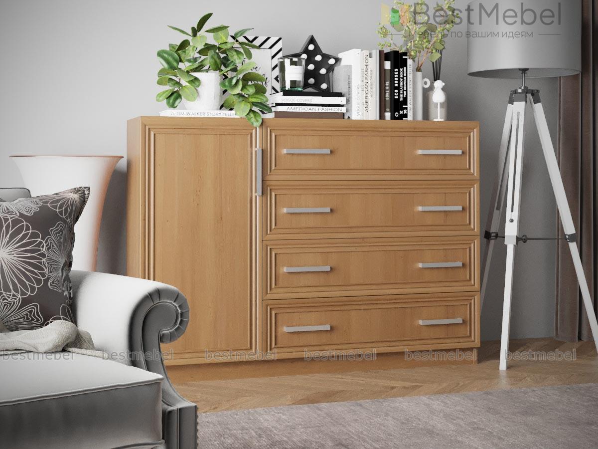 Красивая большая модель современного комода выполненного в классическом стиле. Комод Арлен №8 предназначен для хранения постельного и нижнего белья, домашних вещей и предметов личного гардероба. Для этих целей предназначены четыре объемных выдвижных ящика и распашная тумба с полками. Вы можете изменить базовые параметры или изначальный цвет модели по своему усмотрению. Купить данную мебель можно для большой спальни или детской комнаты, в гостиную или прихожую.