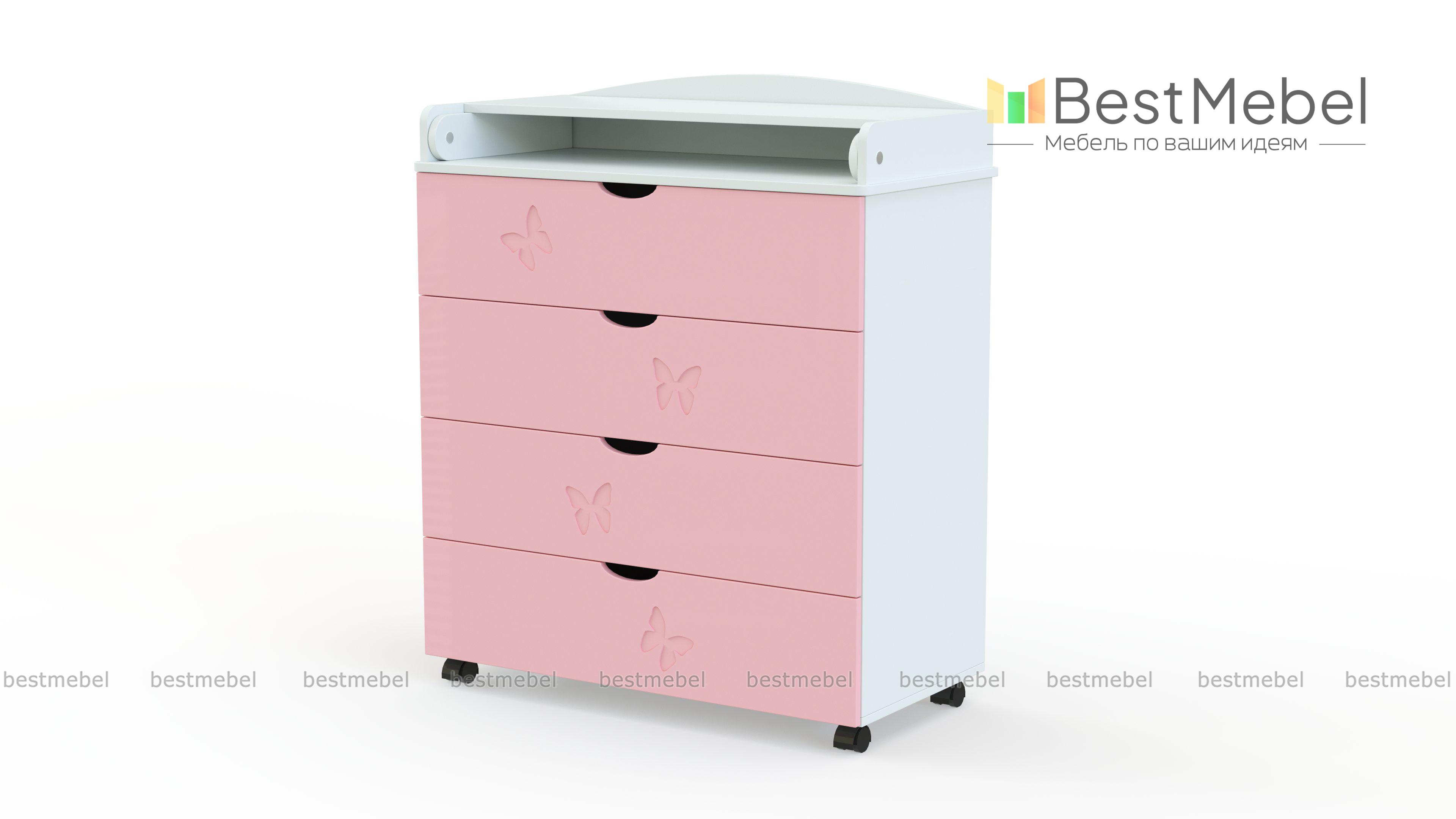 Комод Флай 1 BMS, выполненный в нежной бело-розовой гамме, станет незаменимым предметом меблировки детской. Модель оборудована раскладным пеленатором со скругленными защитными бортиками и четырьмя просторными выдвижными ящиками, в которых удобно хранить постельные принадлежности, одежду и прочие вещи малыша. Фасад комода с ручками-вырезами украшает изящная фрезеровка. Купить комод Флай 1 BMS, оснащенный колесиками для легкости перемещения, приглашаем в наш интернет-магазин.