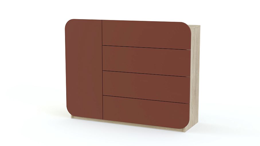Нестандартный дизайн и насыщенная расцветка – это модель для смелых идей в интерьере и современных решений. Четыре выдвижных отделения и одно распашное имеют матовые фасады без ручек, скругленные по краям. Компактный и вместительный, комод МБ 32.1 BMS позволит разместить все необходимые в гостиной, спальне или прихожей мелочи. Столешница подойдет для ТВ или выгодно представит предметы декора. Приобрести модель по доступной цене приглашаем в наш интернет-магазин.