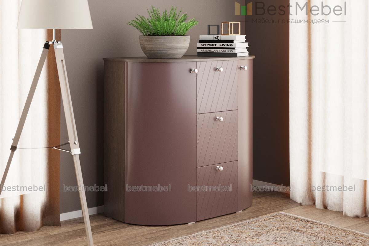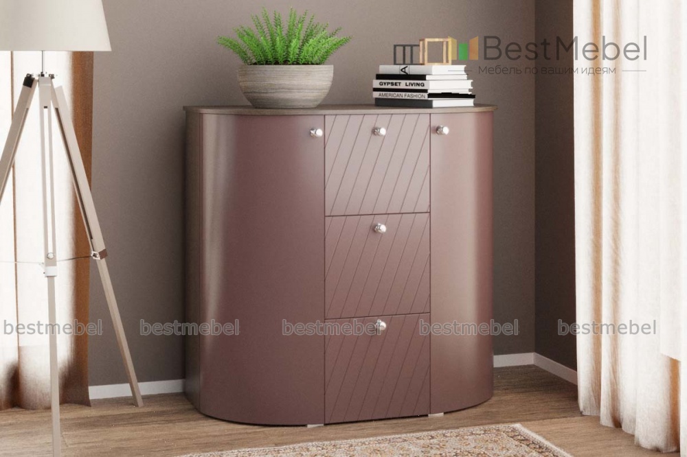 Комод радиусный Нико 2 BMS с корпусом в древесных тонах и гладким фасадом оттенка капучино гармонично впишется в современные интерьеры. Оригинальная модель оборудована скругленной столешницей, тремя глубокими выдвижными ящиками и распашными радиусными отделениями. Благодаря плавным линиям и отсутствию острых углов комод особенно комфортен в эксплуатации и подходит для меблировки малогабаритных помещений. Купить комод радиусный Нико 2 BMS приглашаем на сайт нашего интернет-магазина.