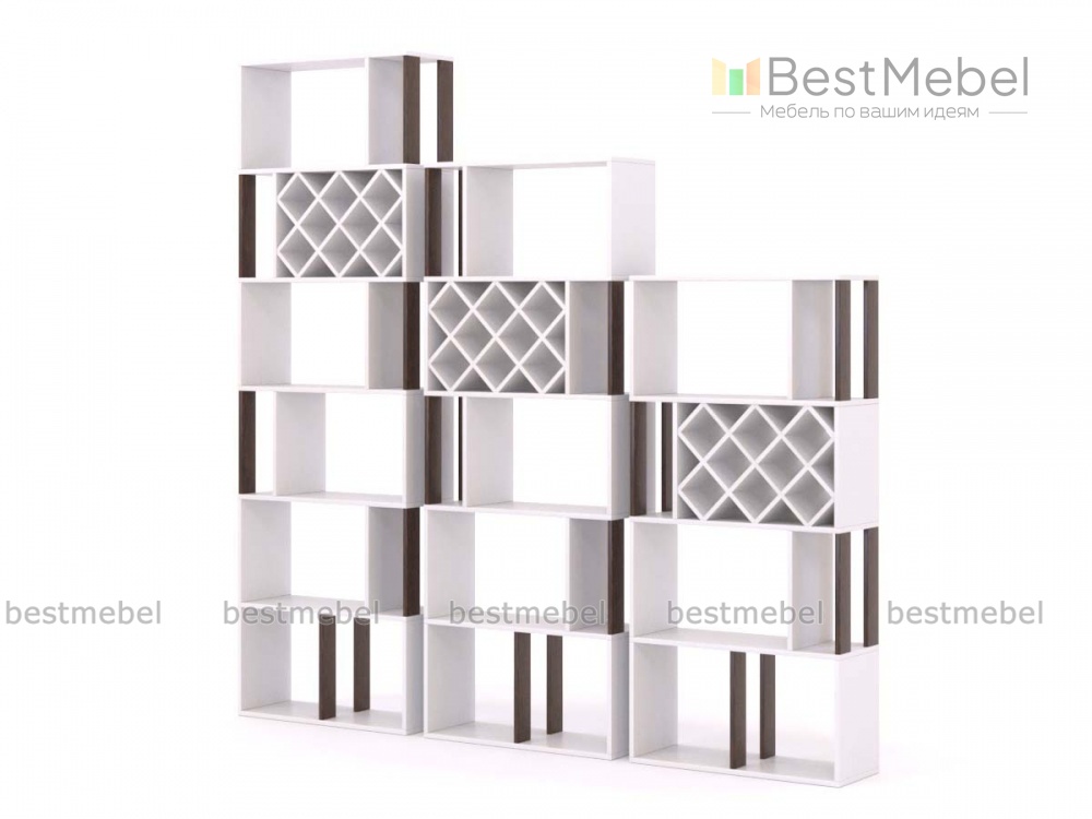 Набор стеллажей Ланс 6 BMS включает в себя три разноуровневых модуля и позволяет создавать интересные композиции, а также использоваться для зонирования. Комбинированные стеллажи оборудованы крестовыми бутылочницами для вин и открытыми полками, предназначенными для книг и предметов декора. Выполненные в универсальном белом цвете, предметы дополнены контрастными опорами. Купить набор стеллажей Ланс 6 BMS для уютного современного интерьера вы сможете в нашем интернет-магазине.