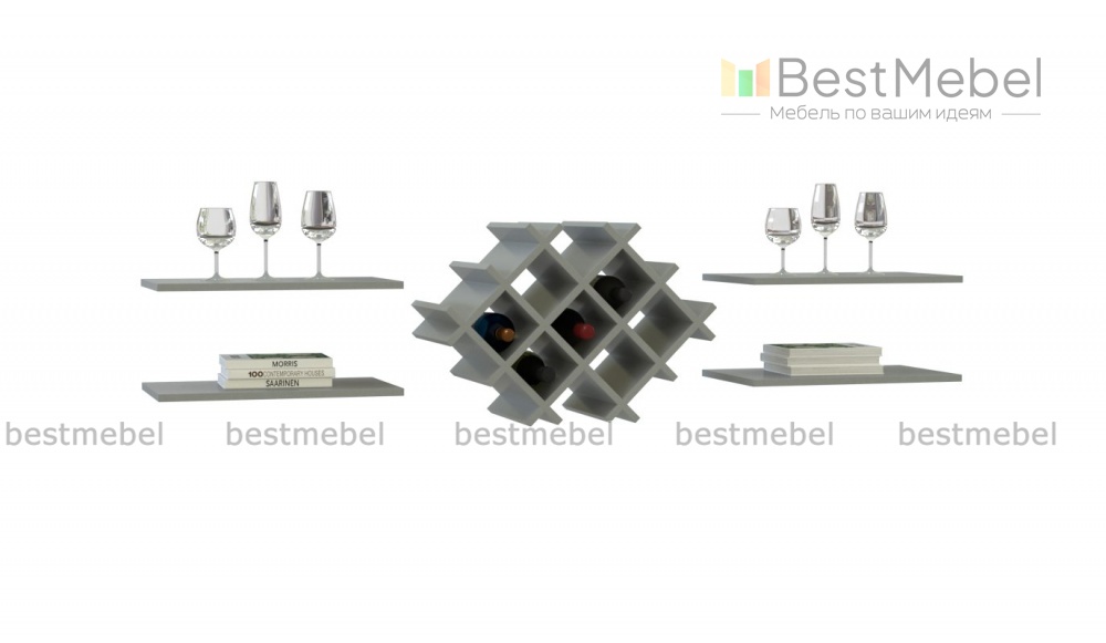 Полка Майкл 2 BMS поможет вам эффектно разместить винные бутылки, бокалы и всевозможные аксессуары. Стильная композиция в ЛДСП платинового оттенка включает в себя крестовую полку с ячейками в виде сот и четыре прямых открытых полки, которые вы сможете комбинировать по своему вкусу. Практичная навесная конструкция сэкономит пространство комнаты и позволит закрепить элементы на любой удобной высоте. Купить полку Майкл 2 BMS приглашаем в наш интернет-магазин с выбором цвета и размеров.