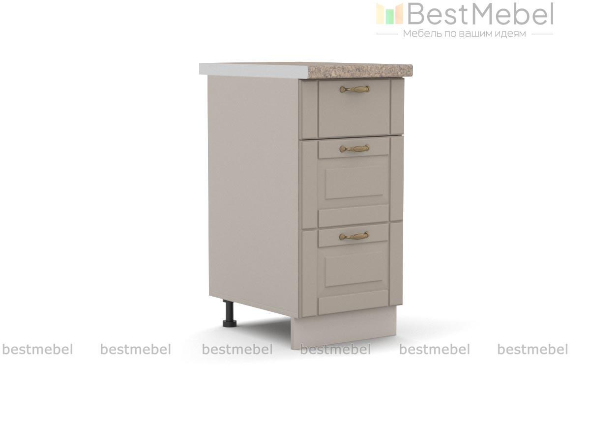 Тумба Клайд 1М 2Б BMS – функциональное дополнение нижнего ряда модульного гарнитура для кухни. Компактная по размеру, тумба оборудована тремя выдвижными ящиками – одним малым и двумя большими, и подходит для хранения столовых приборов, посуды, мелких кухонных аксессуаров. Гармонично вписаться в интерьер помогут фасады, выполненные в характерном для серии пастельном оттенке и декорированные классической фрезеровкой. Купить тумбу Клайд 1М 2Б BMS с учетом необходимых параметров вы сможете в нашем интернет-магазине.