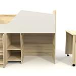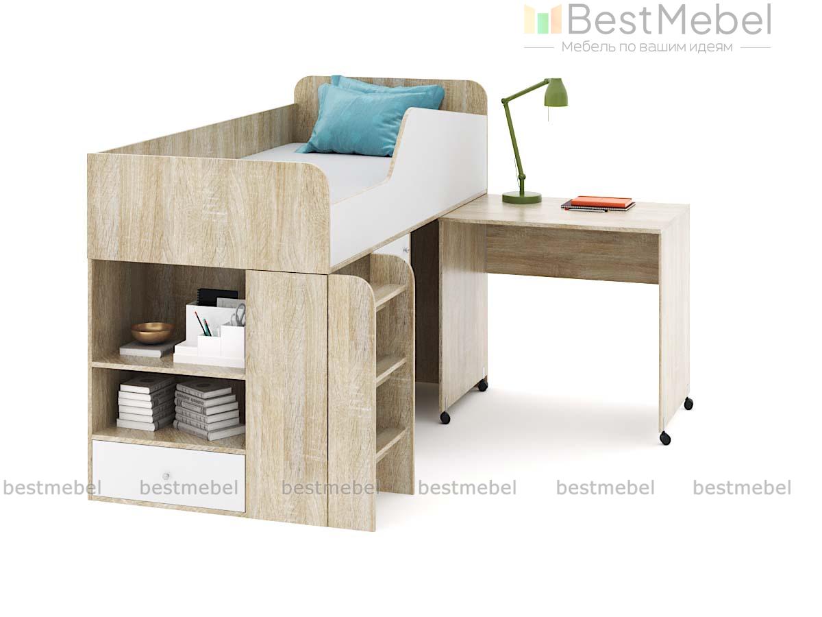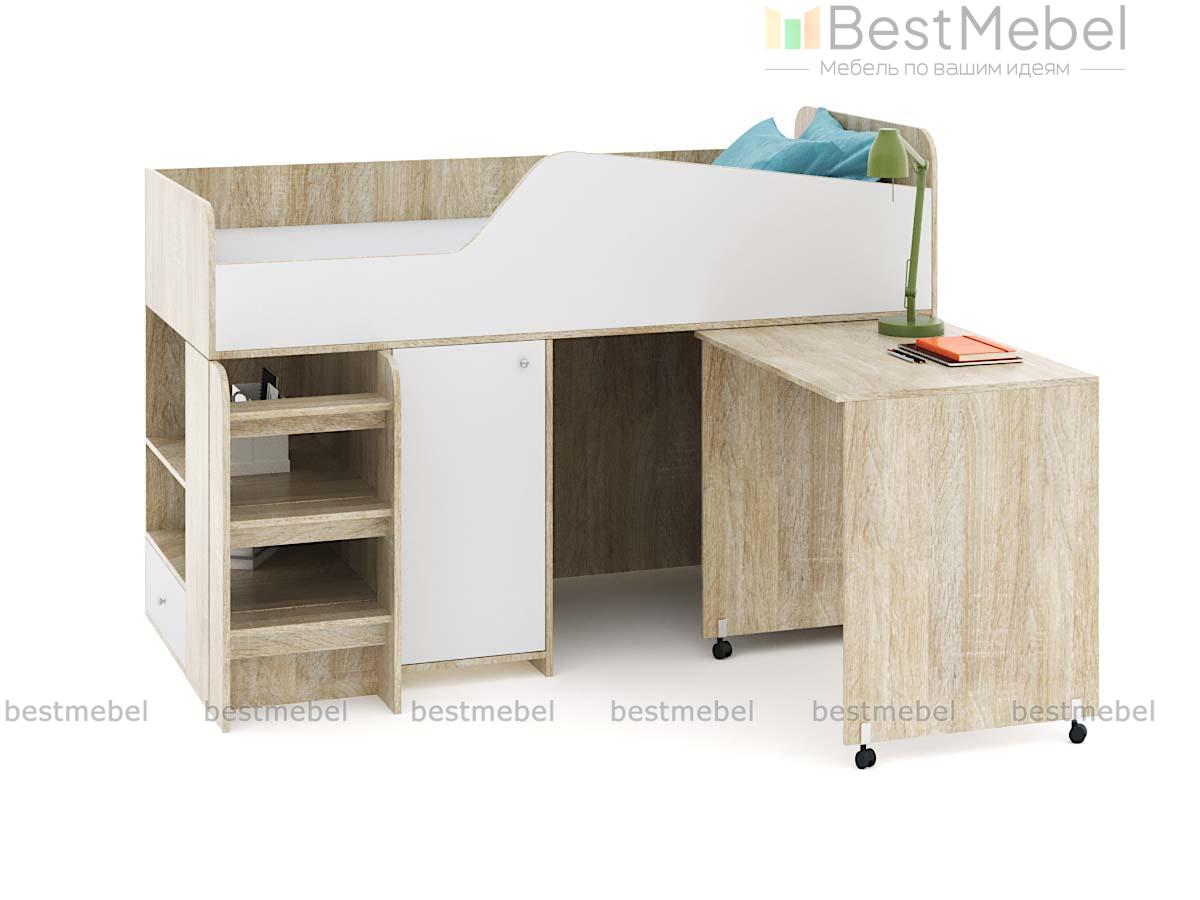 Детская кровать-чердак Дм079 BMS – практичное решение для обстановки комнаты, где нужна зона отдыха и место для учебы. Постель оборудована высоким бортом с внешней стороны – для безопасности малыша. Забраться наверх легко по лесенке с тремя ступенями, они просторные, глубокие. Порадует выдвижной стол, мобильный элемент на колесах. Такая конструкция сэкономит пространство! Есть ниши для хранения, расположенные за лестничным блоком. Цветовая гамма представлена в вариациях, которые будут уместны в интерьере любого типа. Изделие изготовлено из ЛДСП, торцы покрыты кромкой из ПВХ.
