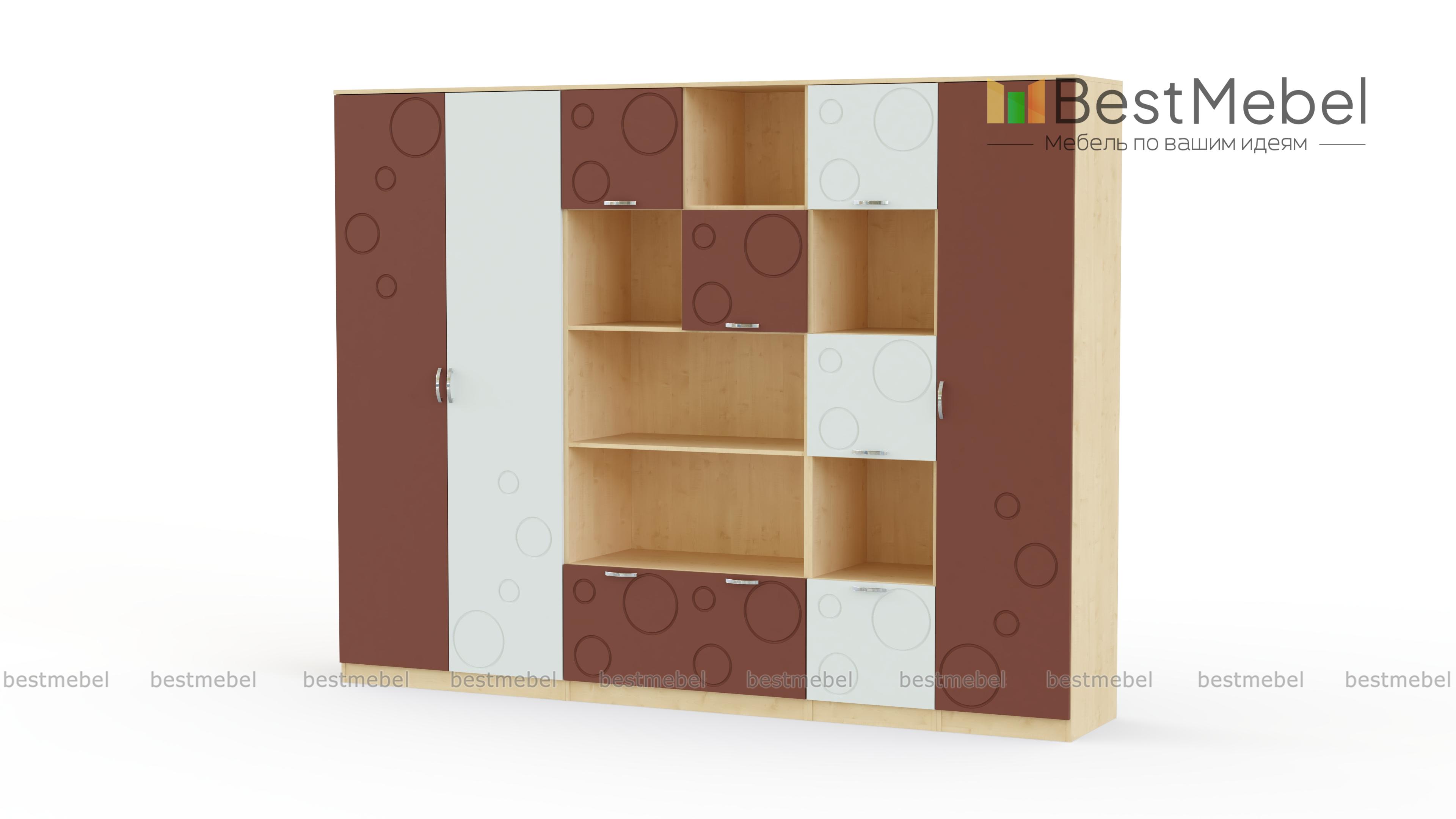 Детская стенка Спринт 1-07 BMS – это современный дизайн и продуманная система хранения, которая удобно разместит вещи ребенка – от предметов гардероба до книг и игрушек. Комплект выполнен в традиционном сочетании корпуса светлых древесных оттенков и пастельных, спокойных цветных фасадов, украшенных неброским симпатичным рисунком. Детская представляет собой композицию из двухдверного платяного шкафа, пенала с полками, комбинированного книжного шкафа и стеллажа с открытыми и глухими отделениями. Купить детскую стенку Спринт 1-07 BMS вы всегда сможете в нашем интернет-магазине.