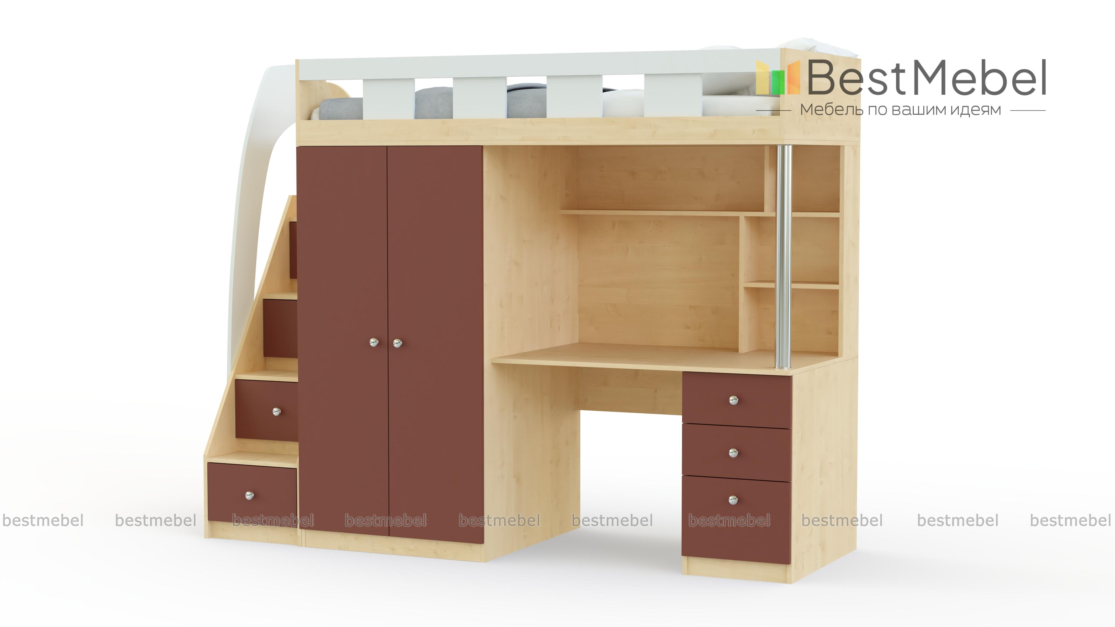 Кровать-чердак с рабочей зоной Клаус 13 BMS станет практичным решением для экономии пространства детской. На втором ярусе располагается просторное спальное место с бортиком, а первый занимают рабочая зона с письменным столом и полками, распашной шкафчик для одежды и лестница-комод с ящиками для игрушек и прочих вещей ребенка. Корпус светлых тонов дополняют цветные фасады, углы кровати безопасно скруглены. Купить кровать-чердак с рабочей зоной Клаус 13 BMS приглашаем в наш интернет-магазин.