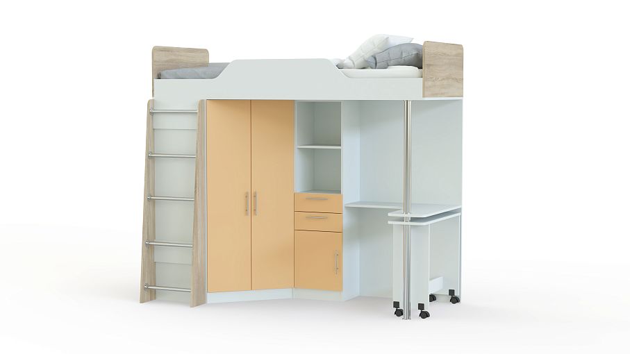 Кровать-чердак со столом Ника 427 BMS – многофункциональная модель, которая станет практичным решением для малогабаритного помещения. Конструкция включает в себя просторное спальное место, оснащенное защитным бортиком, удобную лестницу с хромированными перекладинами, распашной шкафчик с платяным отделением, комбинированный пенал для книг и принадлежностей для школы и творчества и угловой стол с выдвижной секцией. Купить кровать-чердак со столом Ника 427 BMS и оборудовать детскую всем необходимым для комфортного сна, учебы и хранения вещей ребенка, вы сможете с помощью нашего интернет-магазина.