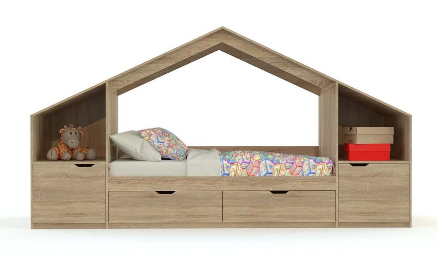 Кровать-домик Марс 10.23 BMS станет практичным решением для узких помещений. Линейная модель в форме домика объединила под «крышей» комфортное спальное место, два выдвижных ящика для хранения игрушек или постельных принадлежностей, две тумбы и просторные ниши. Кровать, выполненная в стильном оттенке, не выглядит громоздко благодаря отсутствию глухой задней стенки. Купить Кровать-домик Марс 10.23 BMS для яркой современной детской вы сможете в нашем интернет-магазине.