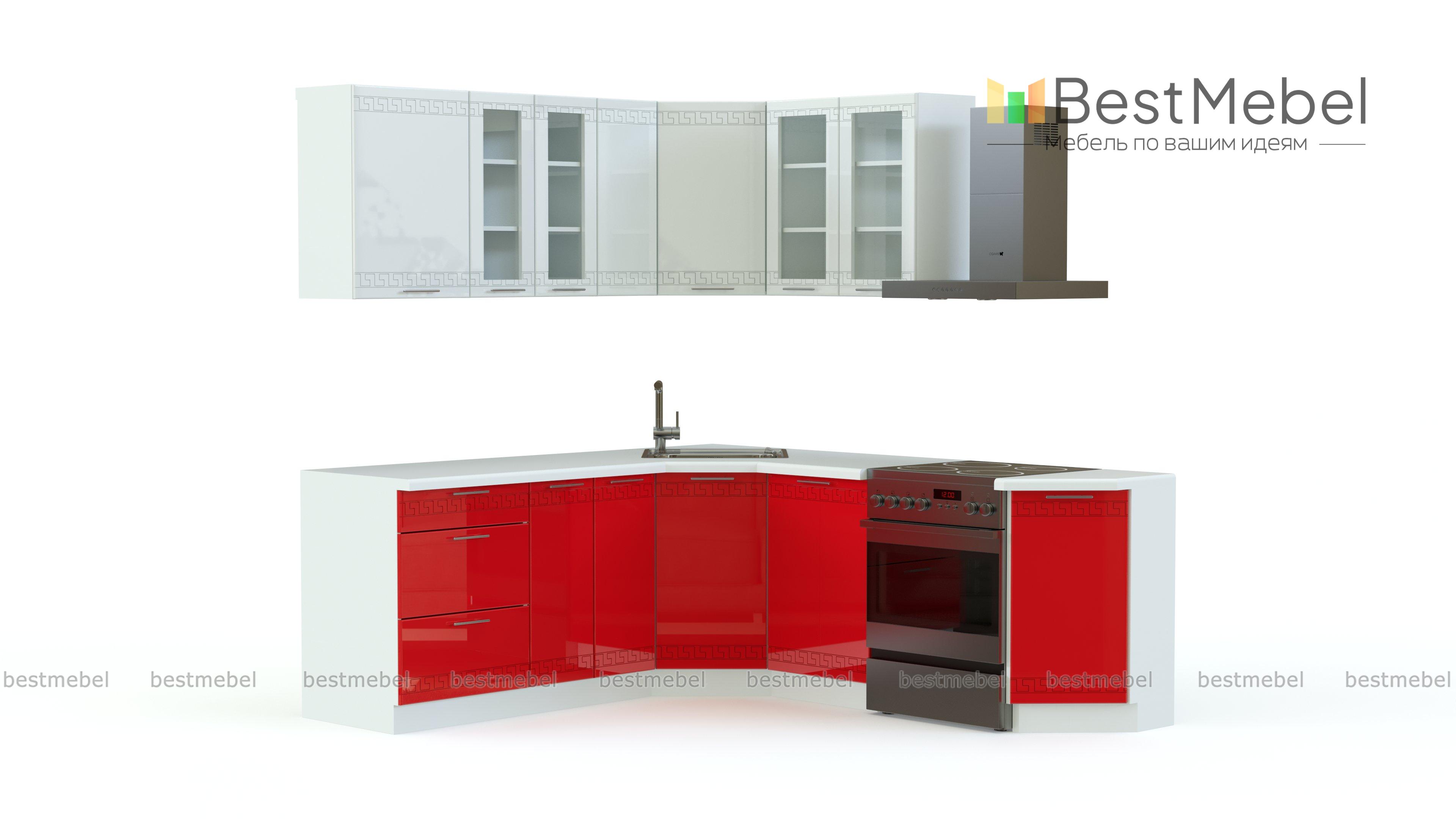 Интересная угловая модель не только украсит Ваш дом, но и принесет с собой уют и комфорт. Выполнена кухня Греция 02 BMS в оригинальном цветовом исполнении, темный низ модных цветов и белый верх ‒ при желании цвета Вы можете поменять. Для удобства пользователей внизу размещается пять больших тумб, особо выделяются оригинально оформленные угловые элементы и пять навесных шкафов, два из которых со стеклянными дверками. Заказать у нас кухню Греция 02 BMS Вы можете, изменив размеры всей модели или ее отдельных элементов.