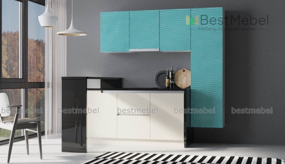 Кухня Мираж-10 BMS станет ультрамодным решением для современной студии. Минималистичный комплект эффектно сочетает поверхности с 3D-рельефом бирюзового цвета и фасады в строгой черно-белой гамме. Геометричная композиция включает в себя разноуровневые навесные шкафчики и напольную группу с барной стойкой, которая незаменима для зонирования и удобна в качестве альтернативы обеденному столу. Купить кухню Мираж-10 BMS, подобрав оптимальные параметры, вы сможете недорого в нашем интернет-магазине.
