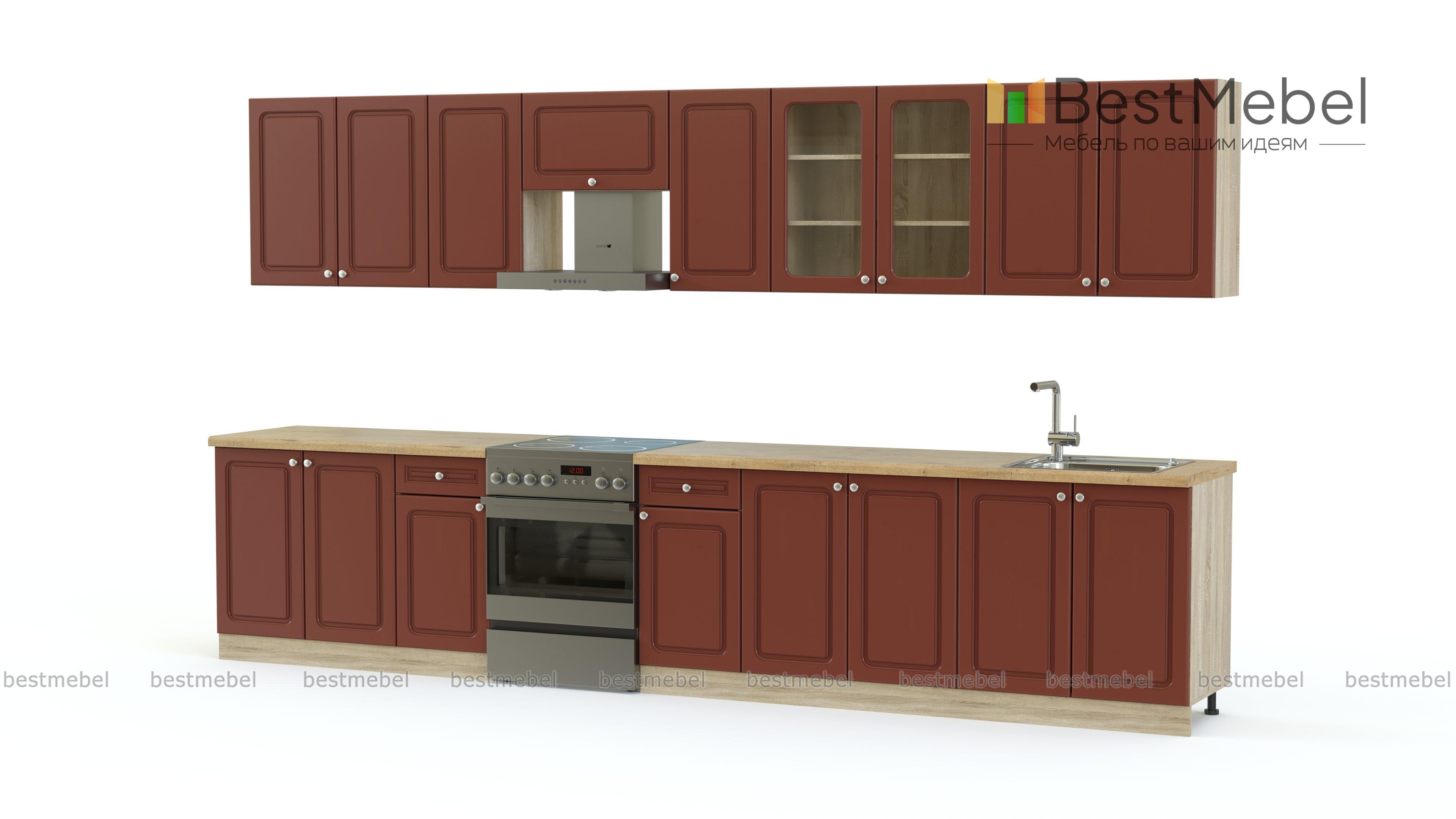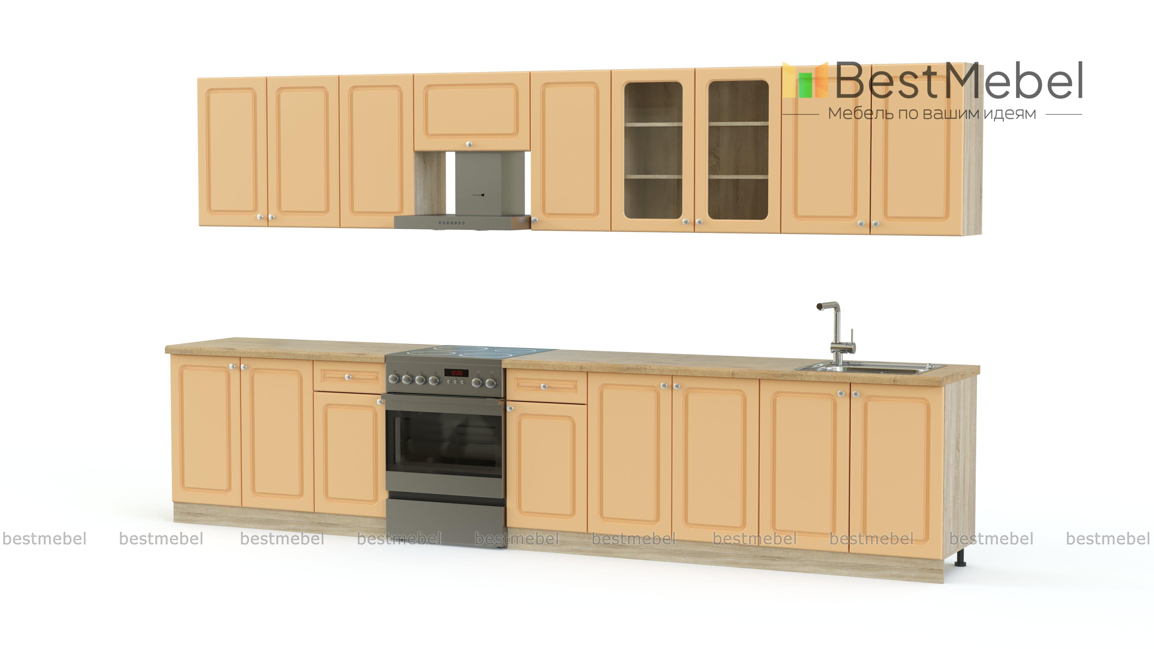 Большая модель предназначена для просторного помещения, выполнена в классическом стиле. Кухня модульная Прага BMS отличается удобным использованием и многофункциональностью. В гарнитур входит все необходимое для того, чтобы Вы чувствовали себя комфортно: три больших и две маленьких тумбы внизу и шесть навесных шкафов, один из которых для посуды украшен стеклянными дверками. Мебель выполнена в контрастных тонах, подобрать цвета Вы можете самостоятельно. У нас Вы можете купить кухню Прага композиция 2 BMS по доступной цене, а также скорректировать размеры модели.