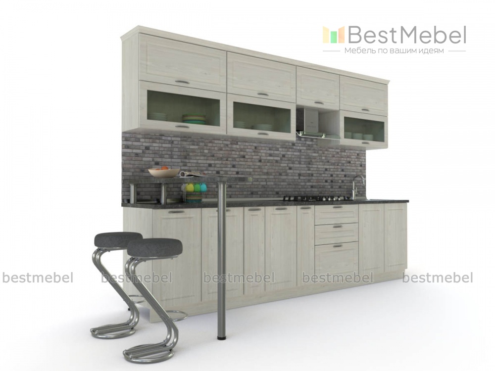 Кухня с барной стойкой Джоли 2 BMS выполнена в современном классическом стиле и отличается элегантным дизайном. Гарнитур с рамочными фасадами и карнизом будет органично смотреться в просторной кухне или студии, помогая создать комфортную обеденную зону. Визуальную легкость модели придают горизонтальные глухие шкафчики и витрины, а эффектной деталью станет приставная барная стойка со скругленной столешницей на хромированной опоре. Купить кухню с барной стойкой Джоли 2 BMS вы сможете в нашем интернет-магазине, подобрав необходимые характеристики.