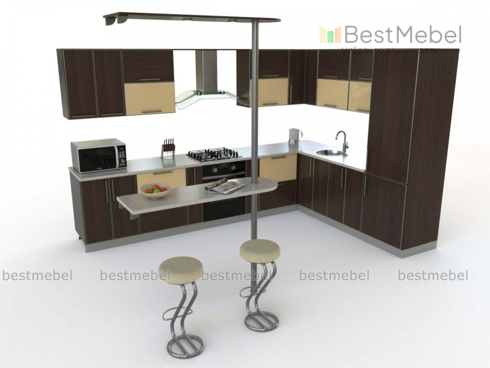 Кухня угловая Рори-1 BMS объединила достоинства угловой модели и основные тенденции в дизайне. Стильный микс темного венге и вставок в ванильном цвете способен создать универсальный и при этом актуальный интерьер. Композиция включает пенал, разноплановые тумбы с распашными дверцами и выдвижными ящиками, а барная стойка на хромированной опоре позволит с комфортом разместиться за завтраком. Купить кухню угловую Рори-1 BMS вы сможете в нашем интернет-магазине по приятной цене.