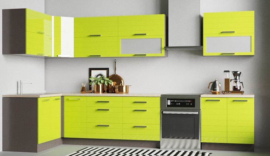 Кухня Виктория 11 BMS поможет создать яркий и позитивный ультрасовременный интерьер. Угловой гарнитур выполнен в современном стиле и лаконичен по форме, а эффектный вид кухне придают фасады в свежем лаймовом оттенке с горизонтальной фрезеровкой. Нижний ряд модулей представлен распашными и выдвижными секциями, а в верхней части располагаются шкафчик-трапеция и открывающиеся вверх глухие отделения и витрины. Купить кухню Виктория 11 BMS по доступной цене приглашаем в наш интернет-магазин, подобрав необходимые параметры.