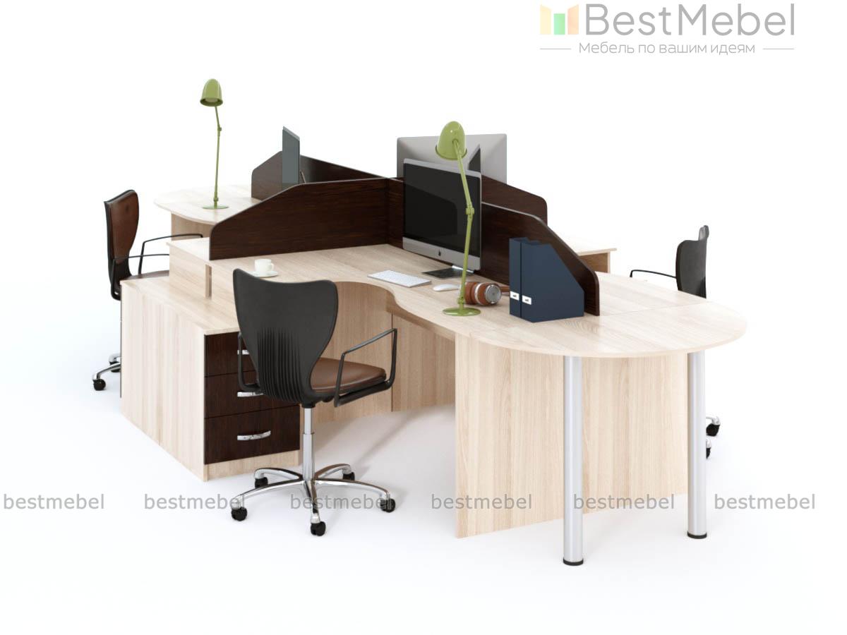 Бенч-система Мэтр BMS объединила в практичной композиции четыре угловых компьютерных стола, приставные тумбы с выдвижными ящиками для канцелярских мелочей и торцевые элементы с хромированными опорами. Система, выполненная в контрастных древесных тонах, гармонично впишется в современные интерьеры и оптимальна для просторных офисов открытого типа. Приватность рабочих зон обеспечат разделительные настольные перегородки. Купить бенч-систему Мэтр BMS вы сможете в нашем интернет-магазине по лучшей цене.