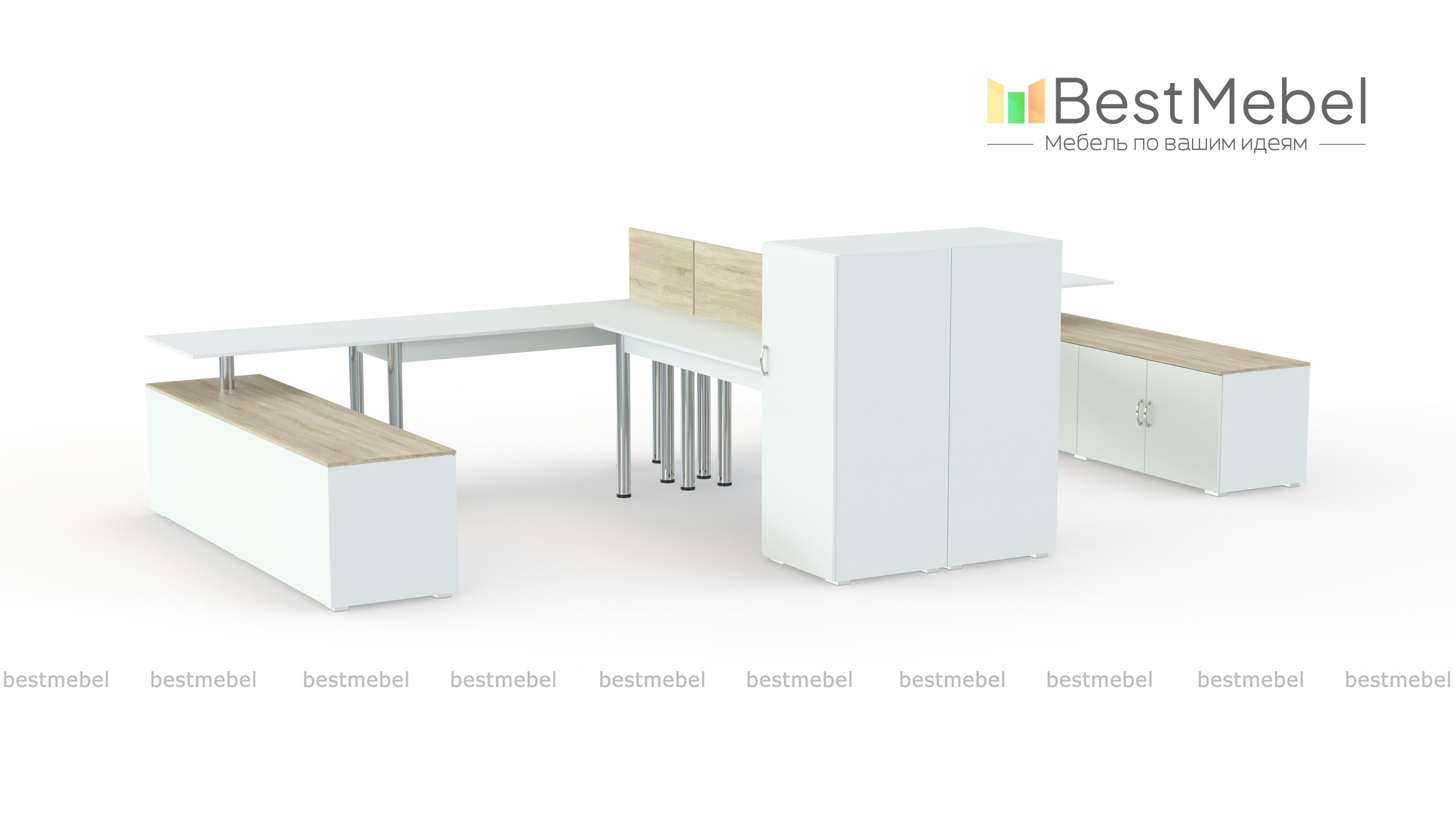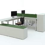 Бенч-система Тим 24 BMS отличается современным, визуально легким дизайном, не перегружая офисное пространство. Сотрудников за угловыми столами на регулируемых металлических ножках разделяет перегородка. Две высокие и две широкие низкие тумбы с распашными дверцами позволят комфортно работать с документами и оргтехникой, разместив все необходимое под рукой. Купить бенч-систему Тим 24 BMS вы сможете в нашем интернет-магазине, подобрав нужные размеры и цветовую гамму.
