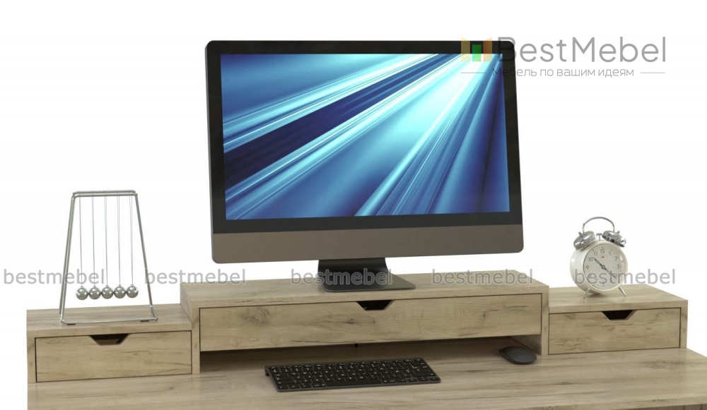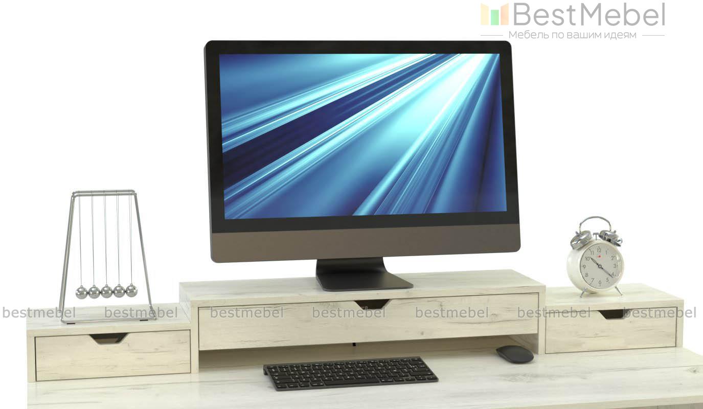 Подставка под монитор Браун-3 BMS оборудована тремя выдвижными ящиками, расположенными ступеньками, и узкой нишей под клавиатуру. Практичная модель устанавливается на столешницу и позволяет приподнять на комфортную высоту монитор, а также оптимизировать хранение мелочей. Благодаря возможности выбора цветового решения подставка органично вписывается в окружающую меблировку. Купить подставку под монитор Браун-3 BMS для дома или офиса вы сможете в нашем интернет-магазине.