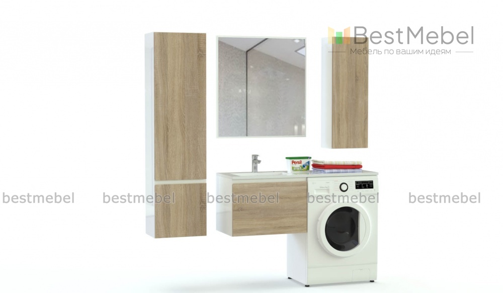 Комплект для ванной комнаты Стайн 2 BMS поможет вам рационально организовать пространство и сэкономить полезную площадь. Подвесная композиция включает в себя тумбу со столешницей под раковину и стиральную машину, высокий пенал, распашной шкафчик и большое прямоугольное зеркало без рамы. Модули минималистичного дизайна просты по форме и выполнены в нейтральном белом и древесном цвете из влагостойких материалов. Купить комплект для ванной комнаты Стайн 2 BMS по доступной цене приглашаем в наш интернет-магазин.