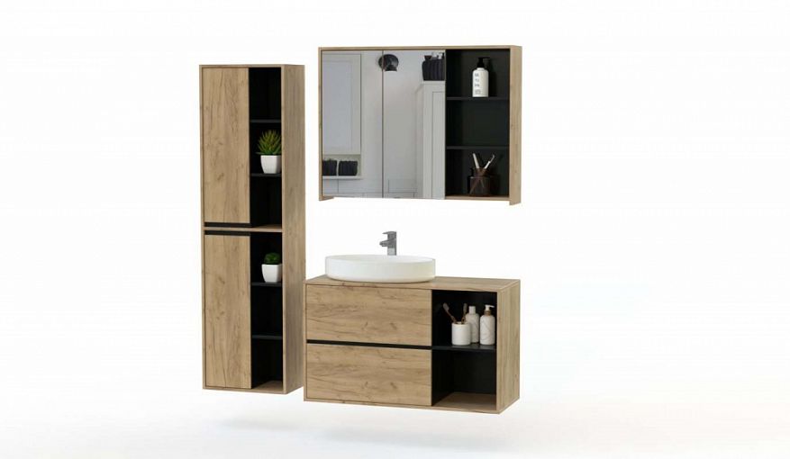 комплект для ванной комнаты Стив 2 BMS станет прекрасным дополнением брутального лофта или интерьера в стиле индастриал. Широкая, нарочито простая по форме модель оборудована распашными отделениями с зеркальным фасадом, выдвижными ящиками и секцией с открытыми полками для хранения базовых гигиенических принадлежностей. Крафтовые древесные оттенки сочетаются в оформлении с контрастным темным антрацитом. Купить комплект для ванной комнаты Стив 2 BMS вы сможете выгодно на сайте нашего интернет-магазина.