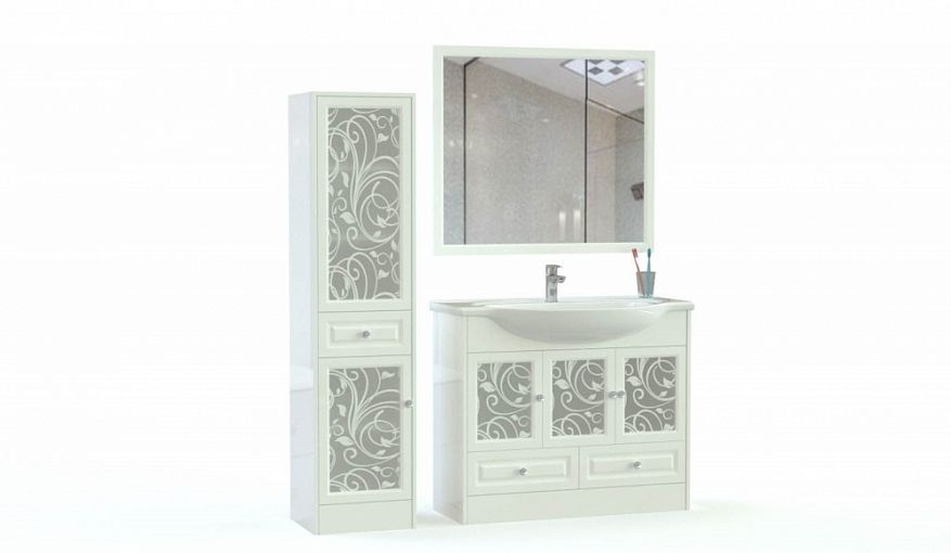 Комплект для ванной Тайти 4 BMS поможет вам создать изящный и визуально легкий интерьер. Композиция для просторной ванной комнаты включает в себя широкую напольную тумбу с тремя распашными дверцами и двумя ящиками для хранения уходовых средств, пенал и большое навесное зеркало с раме. Выполненные в белом цвете с рамочной фрезеровкой, предметы декорированы стеклянными вставками с нежным фантазийным рисунком. Купить комплект для ванной Тайти 4 BMS приглашаем в наш интернет-магазин.