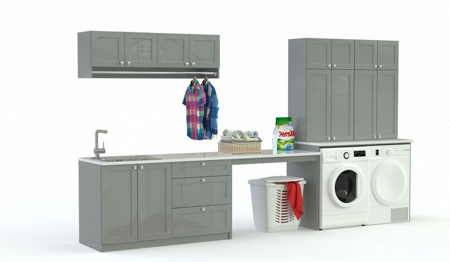 Прачечная Немо 1 BMS предназначена для меблировки просторных помещений в частных домах и оборудована всем необходимым для стирки, сушки и глаженья белья. Композиция в современном классическом стиле станет частью элегантного и комфортного интерьера. В комплект входят секция с мойкой, выдвижными ящиками и просторной столешницей, навесной распашной шкафчик, дополненный штангой, и шкаф с нишей под стиральную и сушильную машины в основании. Купить прачечную Немо 1 BMS приглашаем в наш интернет-магазин с учетом оптимальных параметров.