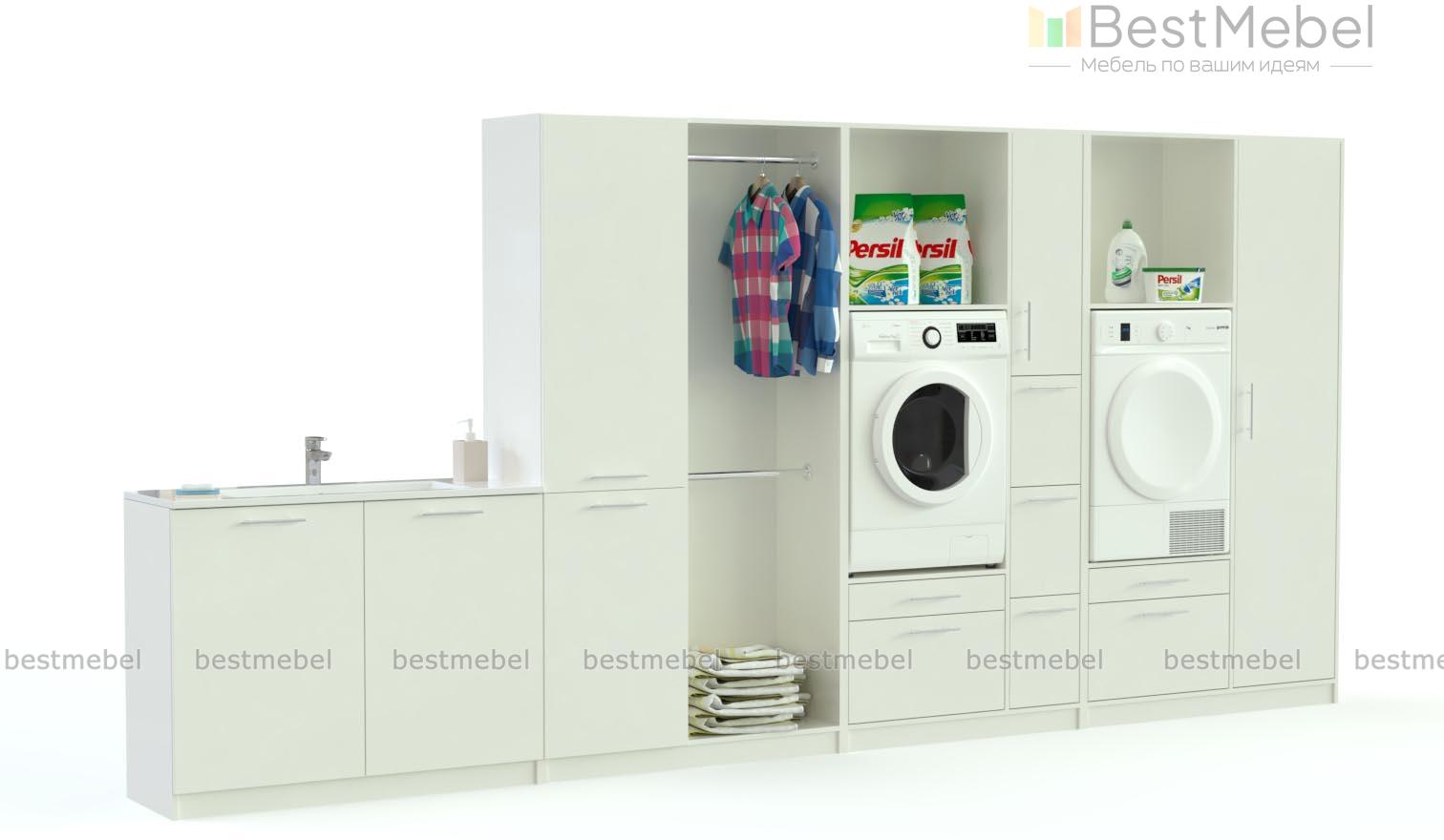 Прачечная Стайл 7 BMS оборудована всем необходимым для стирки, сушки, глаженья одежды и постельного белья, хранения бытовой химии и хозяйственных запасов. Линейная композиция объединила распашную тумбу под мойку, два шкафа - с глухим фасадом, отделение со штангой и сушилкой, ниши под стиральную и сушильную машины, секции для мелочей. Купить прачечную Стайл 7 BMS, выполненную в модной монохромной гамме, приглашаем в наш интернет-магазин.