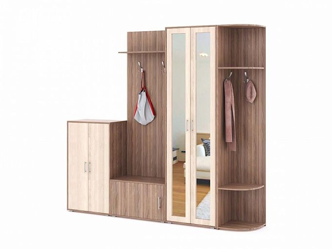 Прихожая Манго 3 BMS компактно разместит вещи и визуально увеличит небольшое помещение благодаря светлым фасадам с зеркалами в полный рост. Модель в современном стиле отличает оригинальная разноуровневость и наличие отделений разного типа, что позволит найти свое место одежде, обуви и аксессуарам. В комплект входят комод с распашными дверцами, платяной зеркальный шкаф, секция с открытой вешалкой, верхней полкой и обувницей и торцевой элемент с полками и крючками. Купить прихожую Манго 3 BMS, подобрав наиболее подходящее цветовое решение, приглашаем в наш интернет-магазин.
