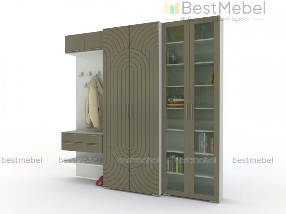 Шкаф в прихожую Ирис BMS – нестандартное решение для меблировки входной зоны. Композиция состоит из двухдверного платяного шкафа, секции с открытой вешалкой, тумбой и антресолью, а также застекленного шкафа для книг и предметов декора. Корпус универсального ванильного цвета сочетается с нейтральными глянцевыми фасадами, дверцы шкафа декорированы фрезеровкой. Купить шкаф в прихожую Ирис BMS и создать комфортный и запоминающийся интерьер вам поможет наш интернет-магазин.