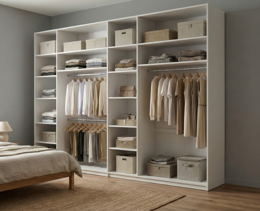 Шкаф для одежды Мартин, выполнен в стиле лофт, дверки без ручек на толкателях, оснащен 3 мя штангами под платье и бельевыми полками.