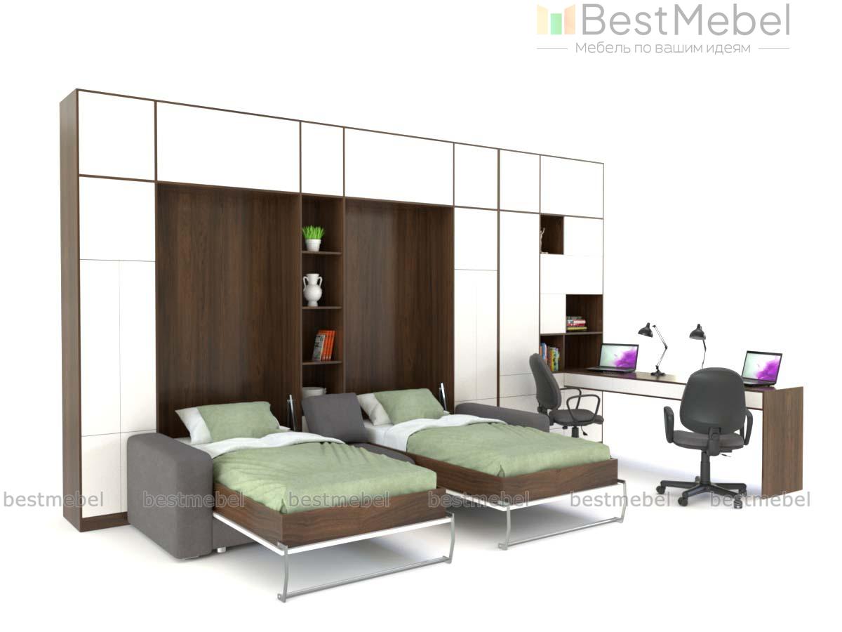 Шкаф-кровать c диваном Вероника BMS – отличный выбор для обустройства современной молодежной комнаты. Многофункциональная композиция, объединившая удобную систему хранения, зону отдыха и рабочее место, позволит значительно сэкономить пространство и создать ультрамодный минималистичный интерьер. Лаконичный шкаф с антресолью, глухими отделениями и открытыми полками дополнен письменным столом с выдвижными ящиками, объемным мягким диваном и двумя раскладными кроватями. Купить шкаф-кровать c диваном Вероника BMS приглашаем в наш интернет-магазин.