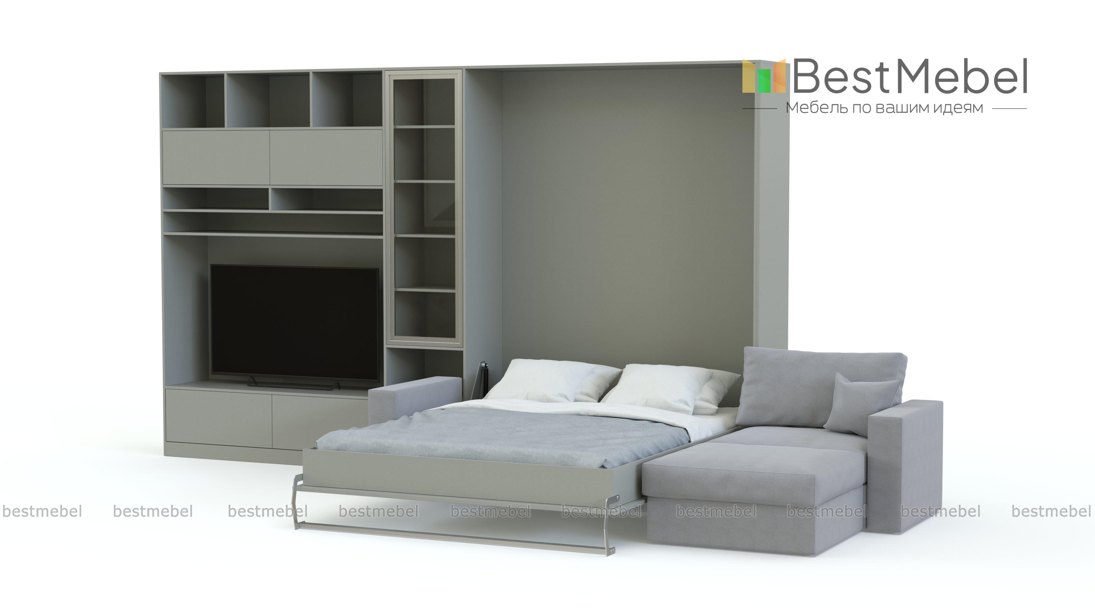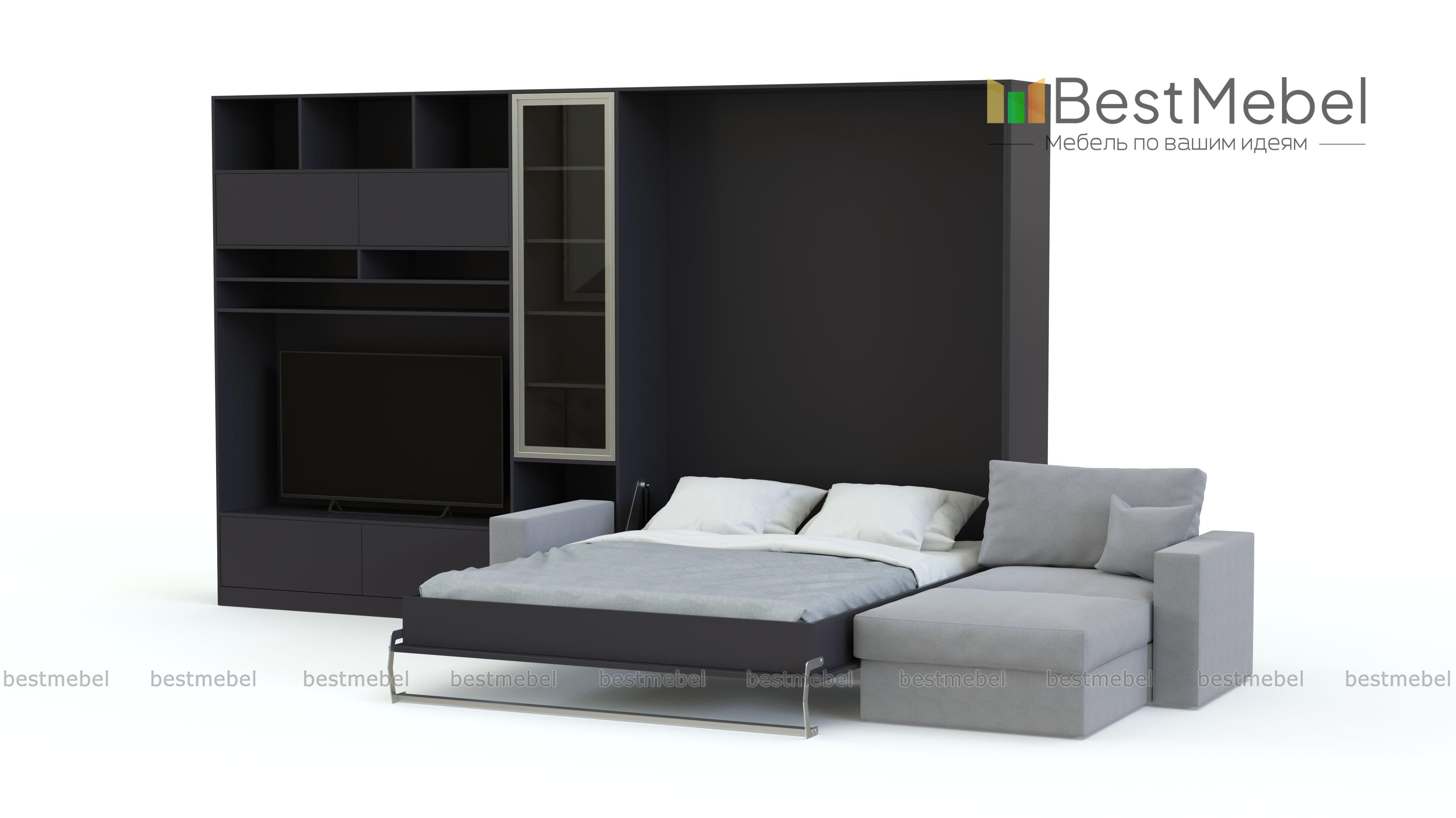 Шкаф-кровать с диваном Блэк BMS выполнен в модной монохромной гамме и гармонично впишется в интерьер просторной современной студии. Минималистичная композиция позволит рационально организовать пространство и вписать все необходимое комфортной зоне отдыха. Угловой комплект включает в себя секцию с тумбой, нишей под ТВ и антресольными полками, витрину, модуль с откидной кроватью и угловой диван-трансформер. Купить шкаф-кровать с диваном Блэк BMS и сделать пользование эргономичным вам поможет наш интернет-магазин.