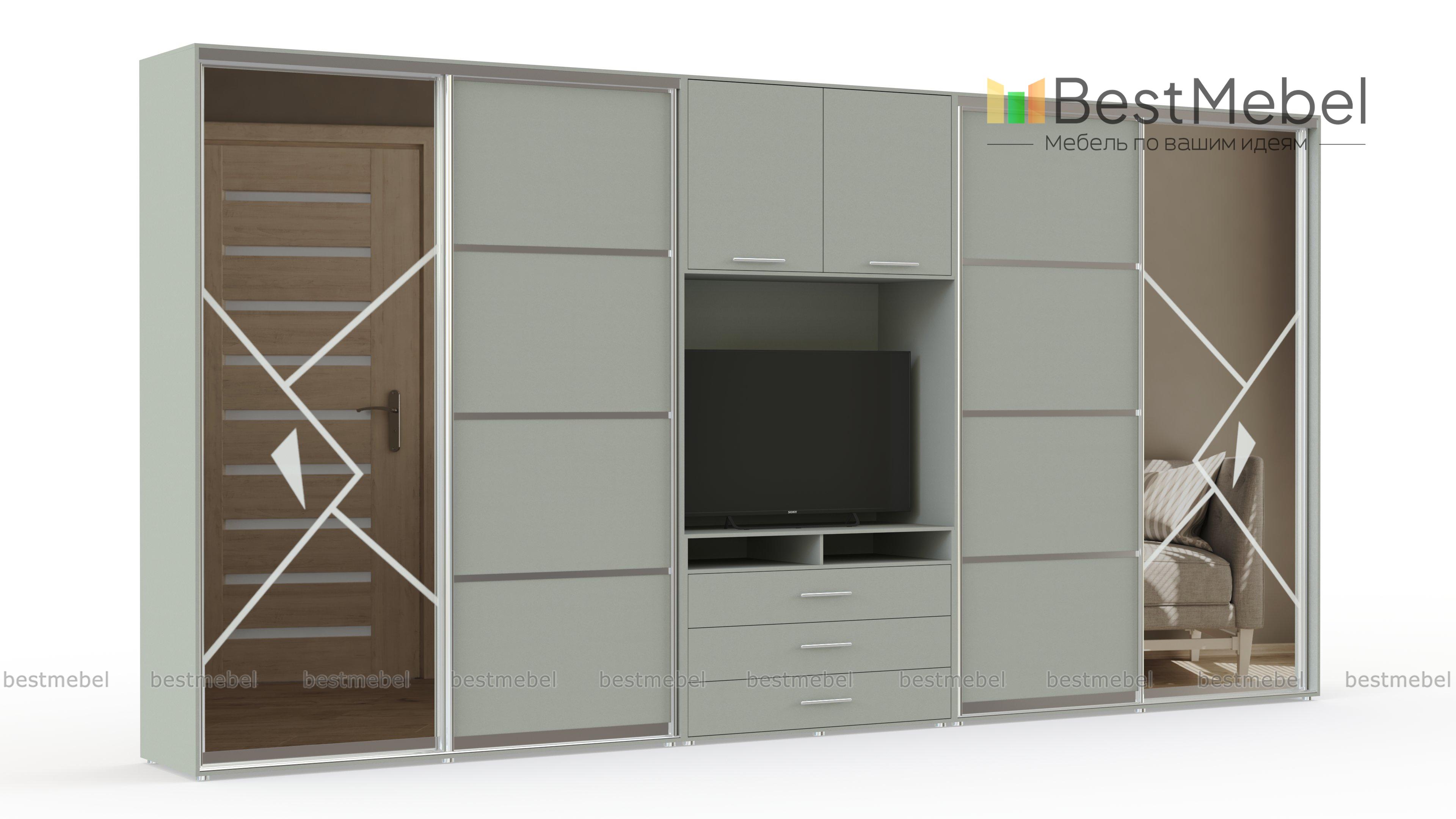 Двойной шкаф-купе Бинг 8 BMS поможет эффективно использовать пространство, полностью заняв одну из стен комнаты. Крупногабаритная конструкция объединила зону ТВ и два двухдверных шкафа-купе с полками и штангами. Продуманная композиция позволит вам разместить аппаратуру, бытовые мелочи, постельное белье и одежду, а украшением интерьера гостиной станут зеркальные фасады шкафов с фантазийным пескоструйным рисунком. Купить двойной шкаф-купе Бинг 8 BMS по выгодной цене приглашаем в наш интернет-магазин.