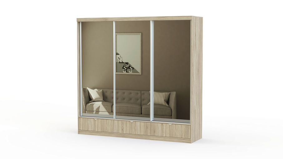 Конструкция шкафа-купе Мадрид – это 6 глубоких ниш для одежды и белья, 3 отдела со штангами для вешалок и 3 выдвижных ящика для обуви, аксессуаров и разных мелочей. Такая корпусная мебель – это вариант для большой семьи. Изготовлен шкаф-купе из ламинированного ДСП, стойкого к механическим повреждениям. Изделие также оснащено алюминиевыми ручками, которые предотвращают коробление двери.