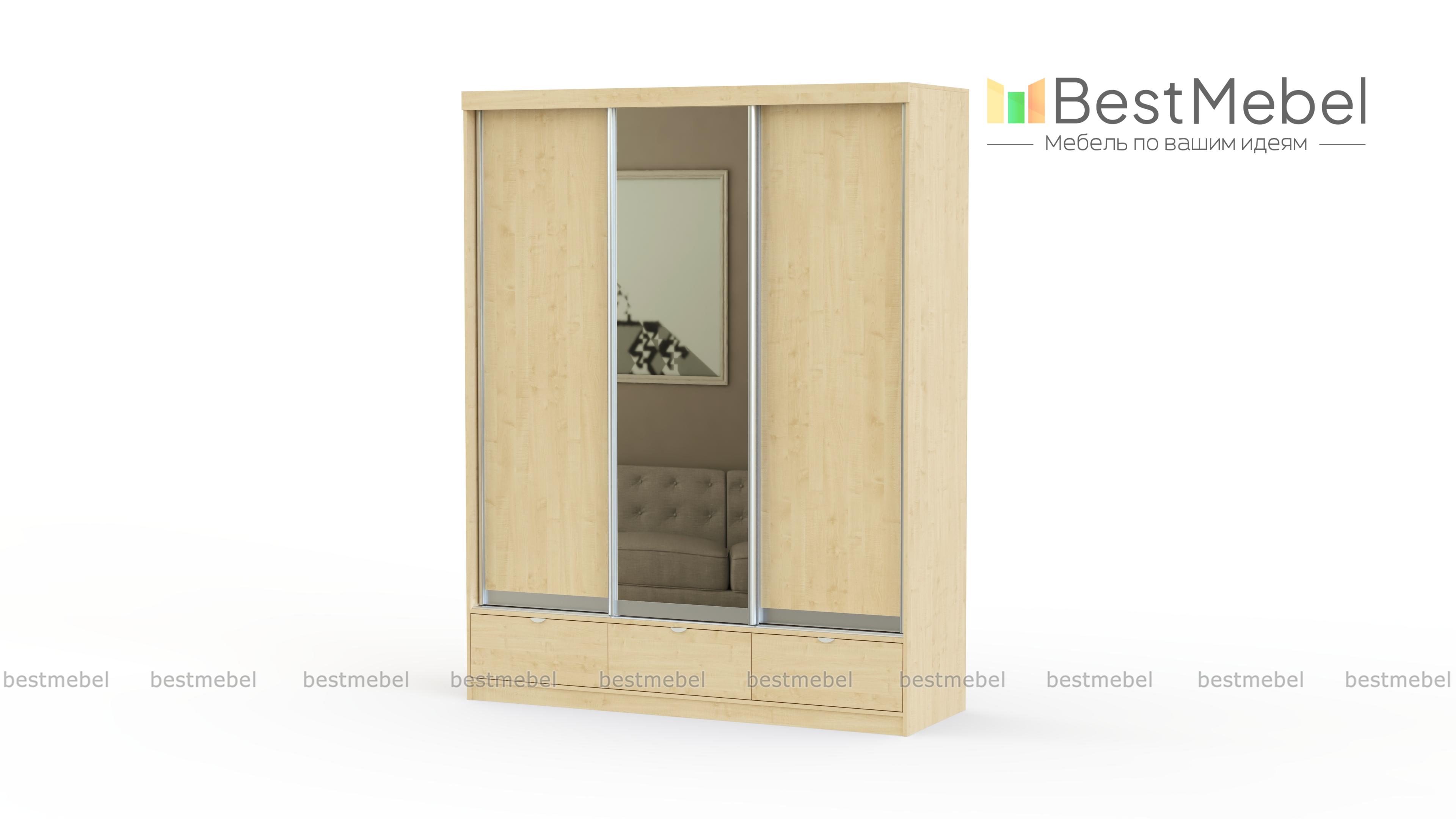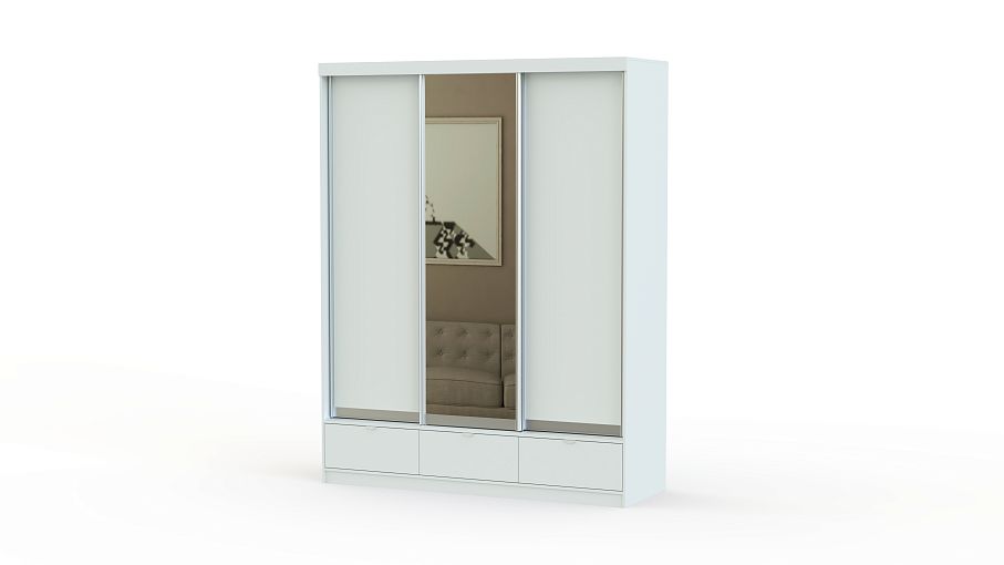 Вместительный трехдверный шкаф с выдвижными ящиками. В центре фасада расположено зеркало, благодаря которому изделие не сморится громоздким и габаритным. Шкаф-купе Мадрид можно поставить около стены в просторном доме, или разделить им помещение на зоны в однокомнатной квартире. Конструкция шкафа предусматривает наличие 6 просторных ниш, 2 отделений со штангами для вешалок и 3 выдвижных ящиков. Изделие изготовлено из ламинированного ДСП, стойкого к механическим повреждениям. Этот материал прост в уходе и имеет сохраняет привлекательный внешний вид.