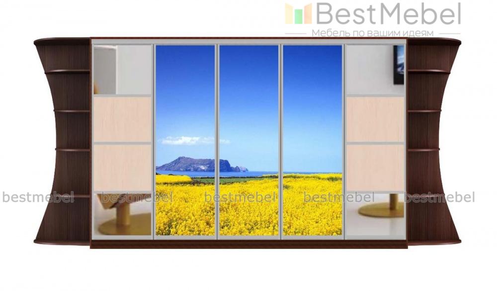 Шкаф-купе Мираж 10 BMS смотрится эффектно с фантазийным рисунком фасада, зеркальными вставками и глубокими фигурными вырезами по бокам. Многофункциональный шкаф предназначен для хранения гардероба, домашнего текстиля, книг и всевозможных бытовых мелочей. Пятидверное отделение-купе дополняют торцевые стеллажи с открытыми скругленными полками. Купить шкаф-купе Мираж 10 BMS, изготовленный по вашим размерам, вы сможете в нашем интернет-магазине.
