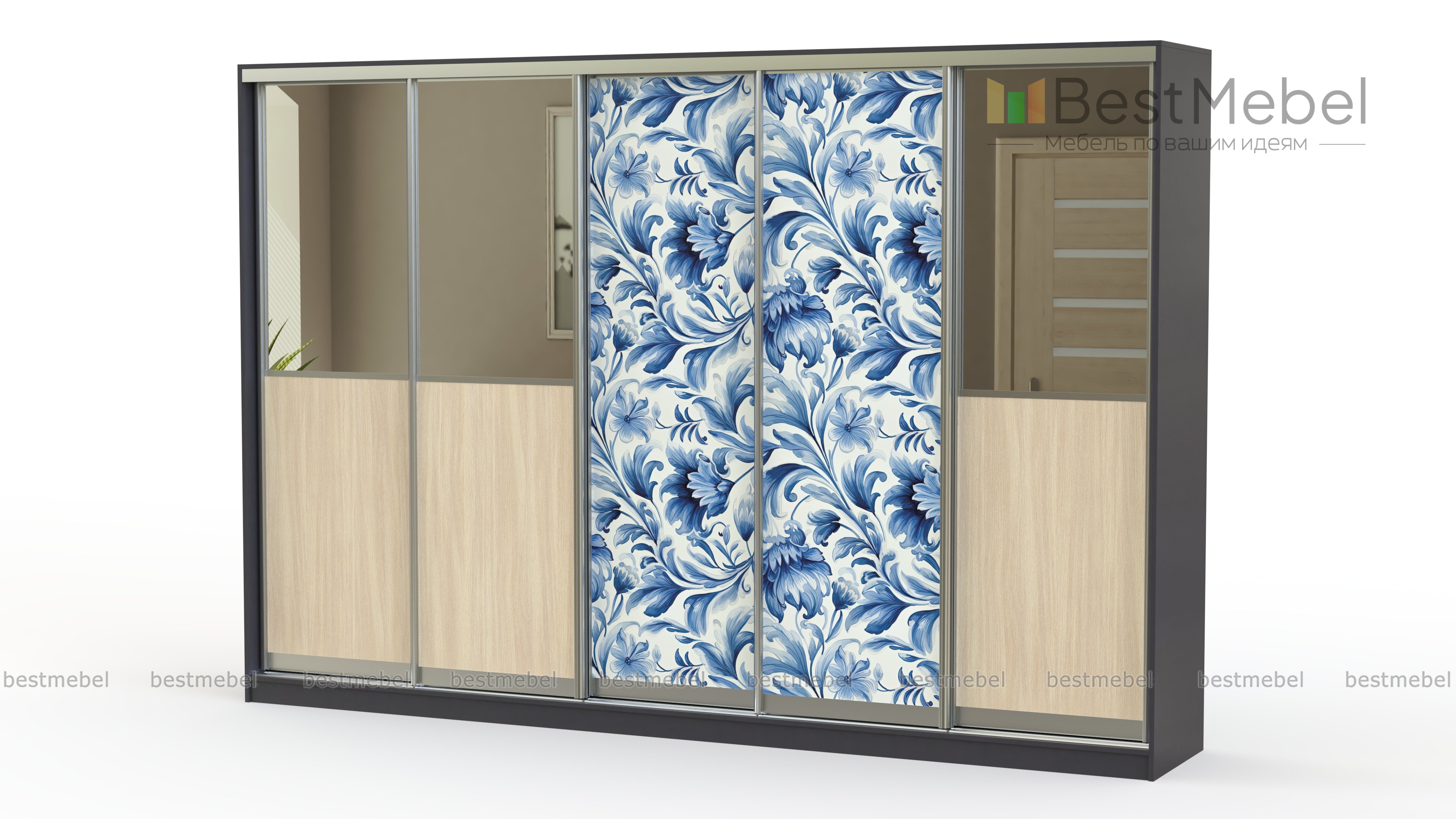 Шкаф-купе Мираж 9 BMS с акцентным фасадом станет прекрасным выбором для создания комфортного и эстетичного пространства. Строгий геометричный дизайн с древесными вставками и зеркалами разбавляет изящная фантазийная фотопечать. Особенную вместительность пятидверной конструкции обеспечивают просторные внутренние отсеки, оснащенные бельевыми полками и платяными штангами. Купить шкаф-купе Мираж 9 BMS вы сможете в нашем интернет-магазине, подобрав размеры и цветовое решение по своему вкусу.