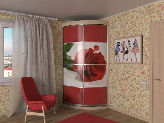 Шкаф-купе радиусный Роза BMS займет центральное место в интерьере благодаря яркому дизайну фасада. Выпуклые дверцы насыщенно-красного цвета с профилем в оттенке серебро декорированы крупной цветочной фотопечатью. Угловая конструкция с максимальной эффективностью сможет задействовать доступное пространство и скорректировать недостатки планировки. Плавные линии без острых углов сделают пользование комфортным и безопасным. Купить шкаф-купе радиусный Роза BMS и бережно разместить белье и одежду вам поможет наш интернет-магазин.