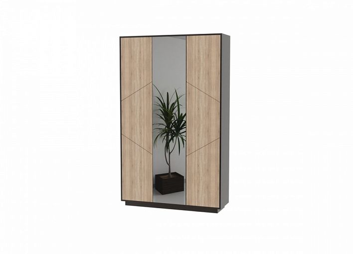 Распашной шкаф 3Д Нирвана BMS – крупногабаритная современная модель, которая станет эффектным дополнением интерьера спальни, гардеробной или прихожей. Особенность шкафа – минималистичный дизайн и нестандартное сочетание фактур. Корпус темных оттенков под массив дерева скомбинирован со светлыми фасадами. Боковые дверцы – глухие с геометричным декором, центральная – зеркало. Внутреннее наполнение из платяного отделения и бельевой секции с полками подходит для размещения вешалок с одеждой, обуви и аксессуаров. Купить распашной 3Д Нирвана BMS по отличной цене приглашаем в наш интернет-магазин.