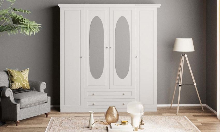 Шкаф Арина-121 BMS может использоваться как самостоятельно, так и в комплекте с другими модулями классической серии. Визуально легкий несмотря на габариты, четырехдверный комбинированный шкаф оборудован распашными отделениями для белья и одежды и двумя широкими выдвижными ящиками. Белоснежный фасад украшен фрезеровкой, центральные створки дополнены овальными зеркалами, незаменимыми для примерки и ухода за собой. Купить шкаф Арина-121 BMS, который бережно разместит гардероб и постельные принадлежности, приглашаем в наш интернет-магазин.