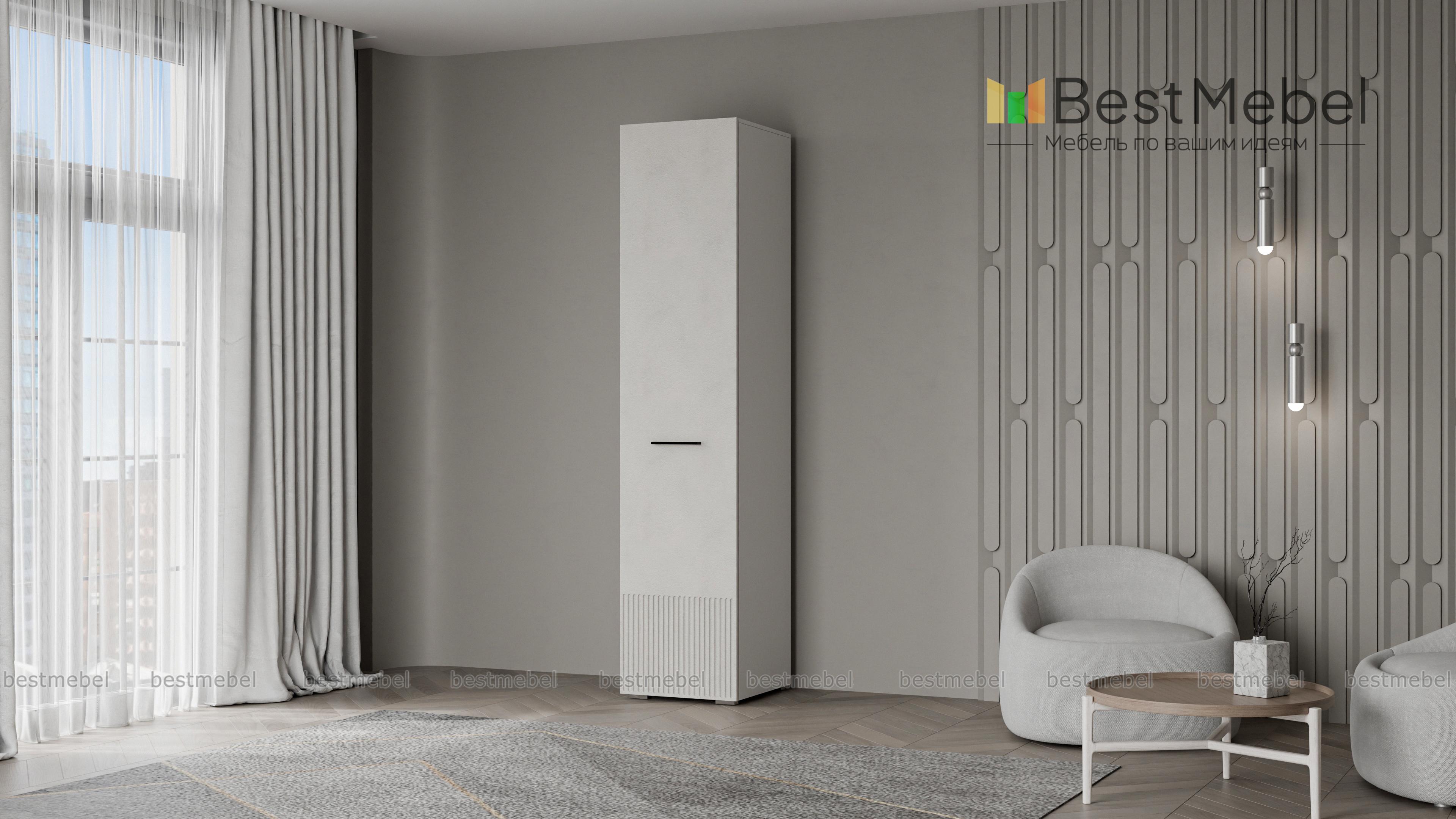 Шкаф распашной Декарт 1 BMS вы сможете использовать отдельно и в сочетании с другими шкафами серии. Пенал в светлом дизайне с фрезерованным декором идеально подходит для компактных комнат. Компоновка с вешалкой и верхней полкой — комфортная база для повседневных вещей, а распашная дверца со стильной ручкой-скобой обеспечивает им отличный обзор. Купить шкаф распашной Декарт 1 BMS приглашаем на сайт нашего интернет-магазина, по желанию изменив цвет и размеры.