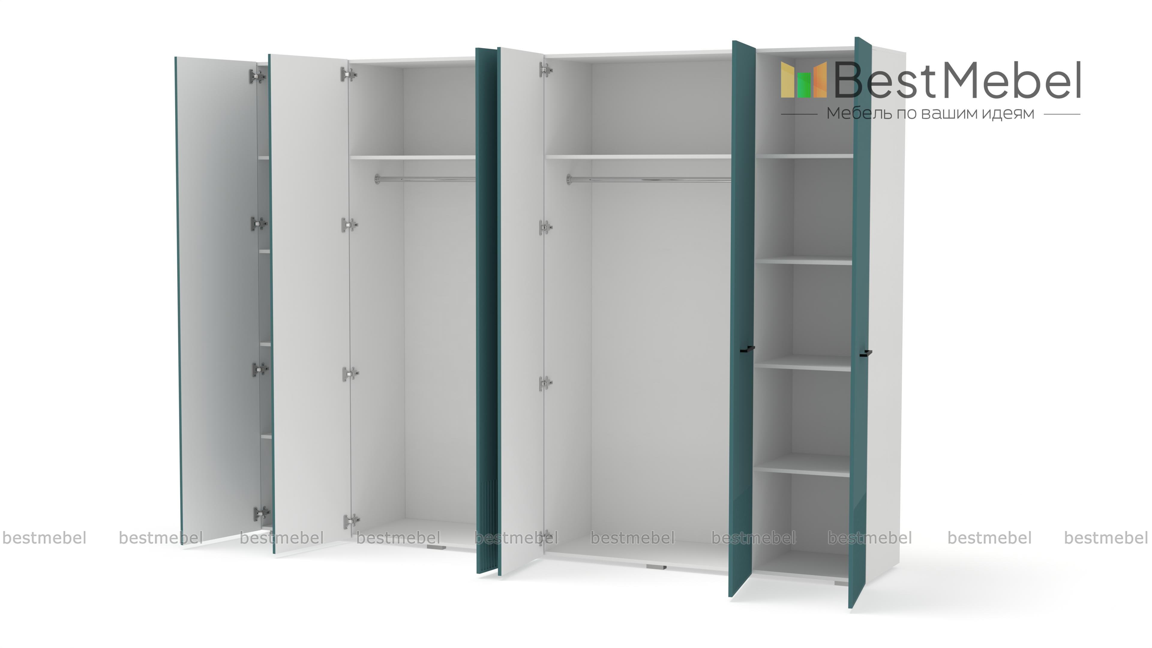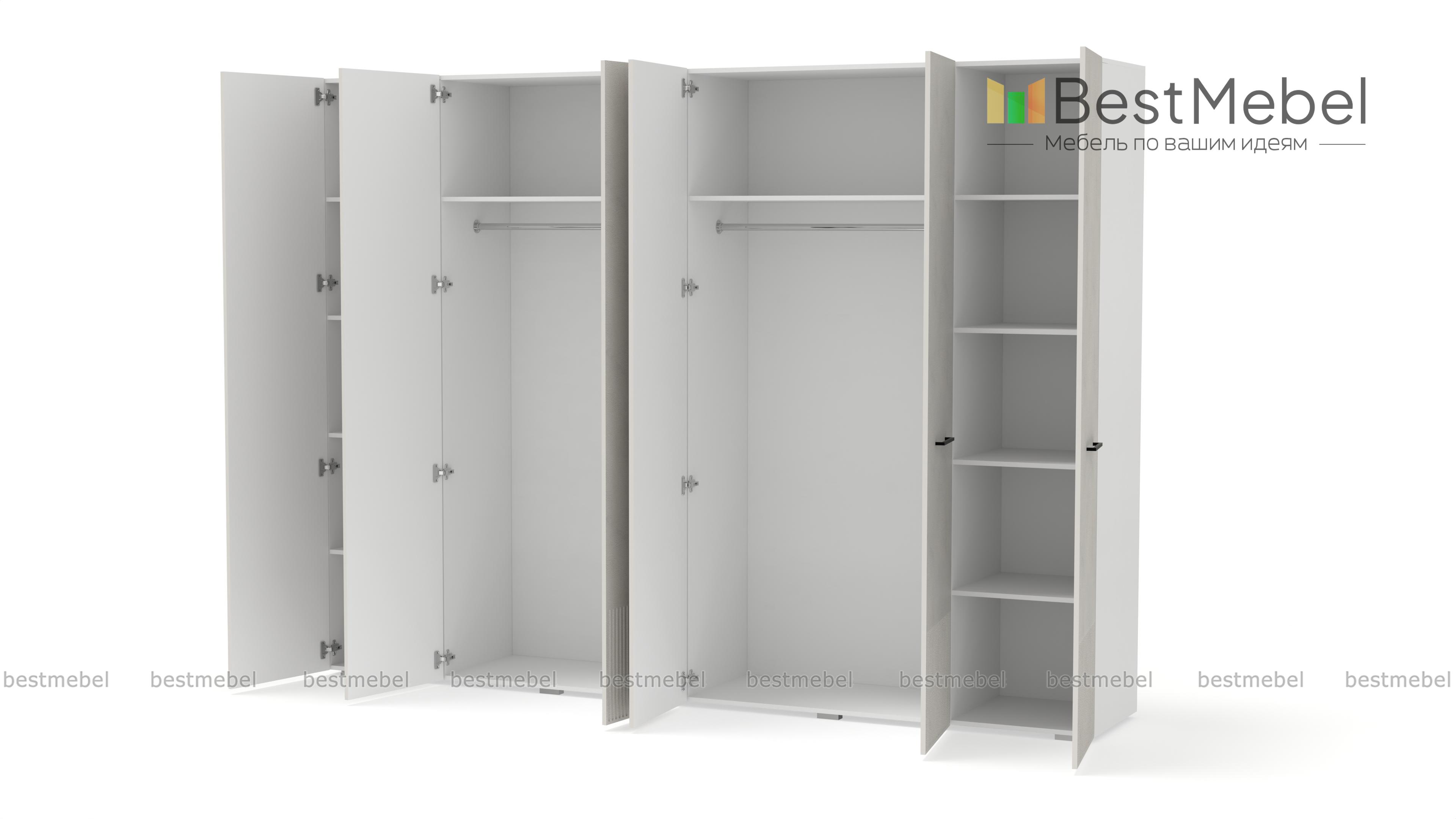 Шкаф распашной Декарт 6 BMS с шестью дверцами создан для хранения в просторных комнатах и обладает отличной вместительностью. Габариты шкафа скрадывает светлый оттенок, фрезеровка в нижней части фасада — практичное и стильное решение. Порядок в вашем гардеробе помогут легко поддерживать две центральные штанги и вместительные бельевые полки по бокам. Купить шкаф распашной Декарт 6 BMS, изготовленный по вашим размерам, приглашаем на сайт нашего интернет-магазина.