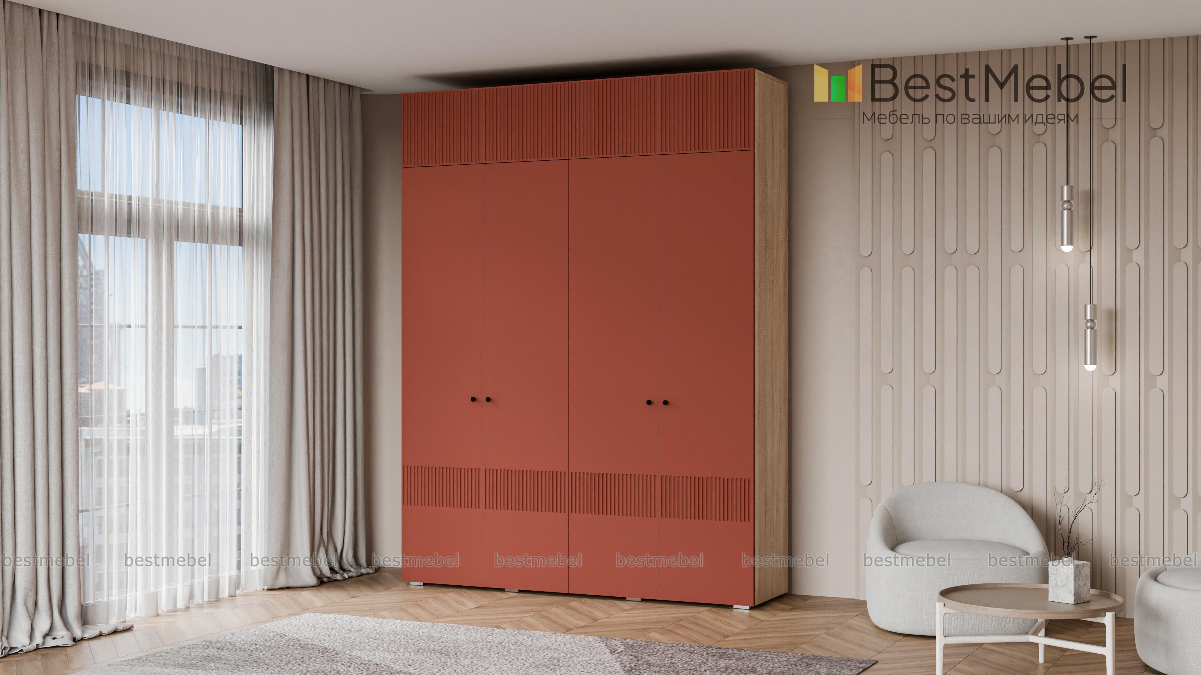 Шкаф распашной Джосс 10 BMS с четырьмя дверцами и антресолью можно разместить в разных комнатах: небольших спальнях, прихожих и детских. Оригинальные оттенки корпуса и фасада создают комфортную атмосферу в помещении, стильный акцент в отделке — фрезерованный орнамент. За дверцами справа скрыты штанга и полка, а слева — узкая платяная секция и бельевой стеллаж. Купить шкаф распашной Джосс 10 BMS с выбором размеров, цвета и фурнитуры вы сможете недорого в нашем интернет-магазине.