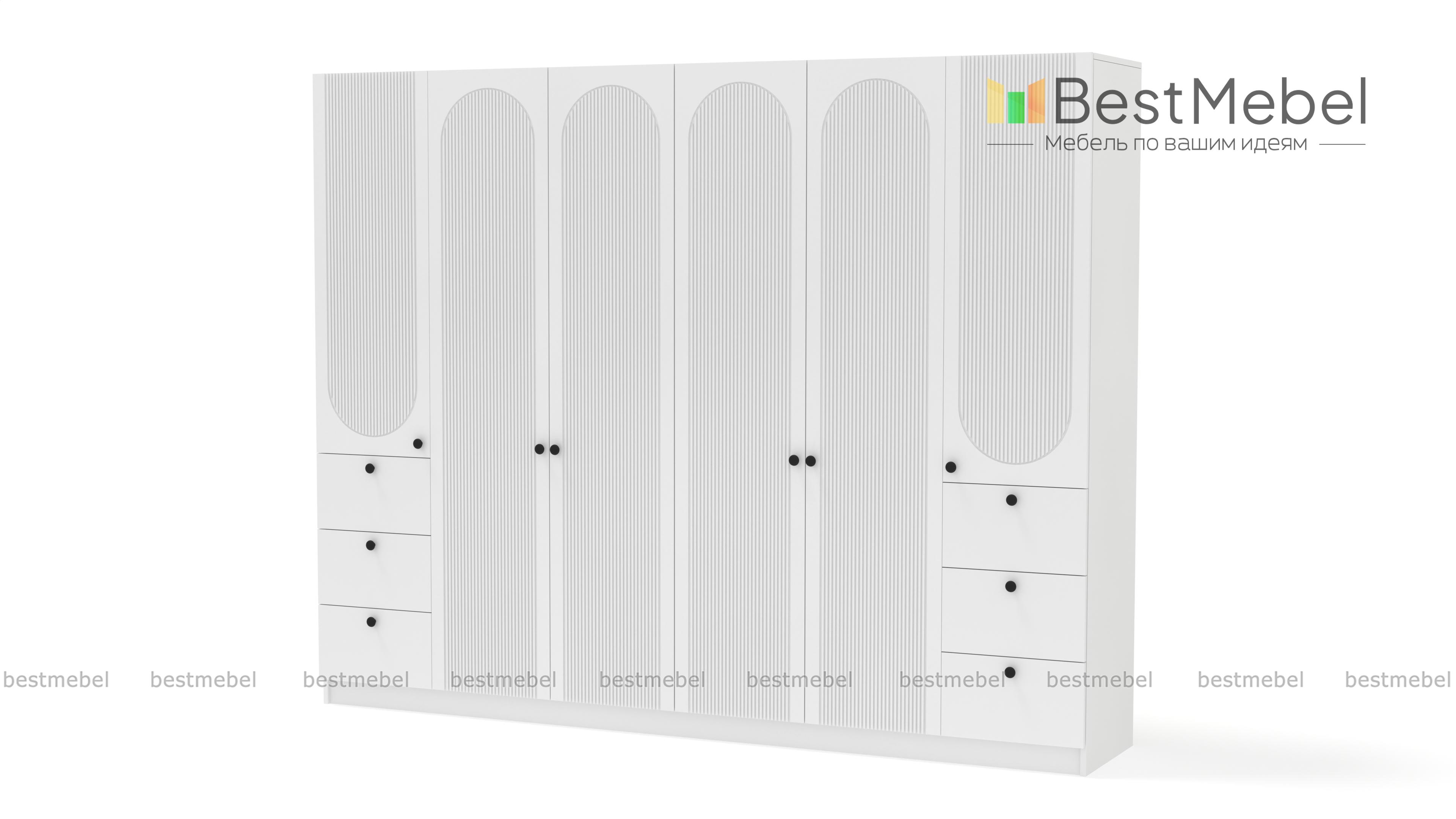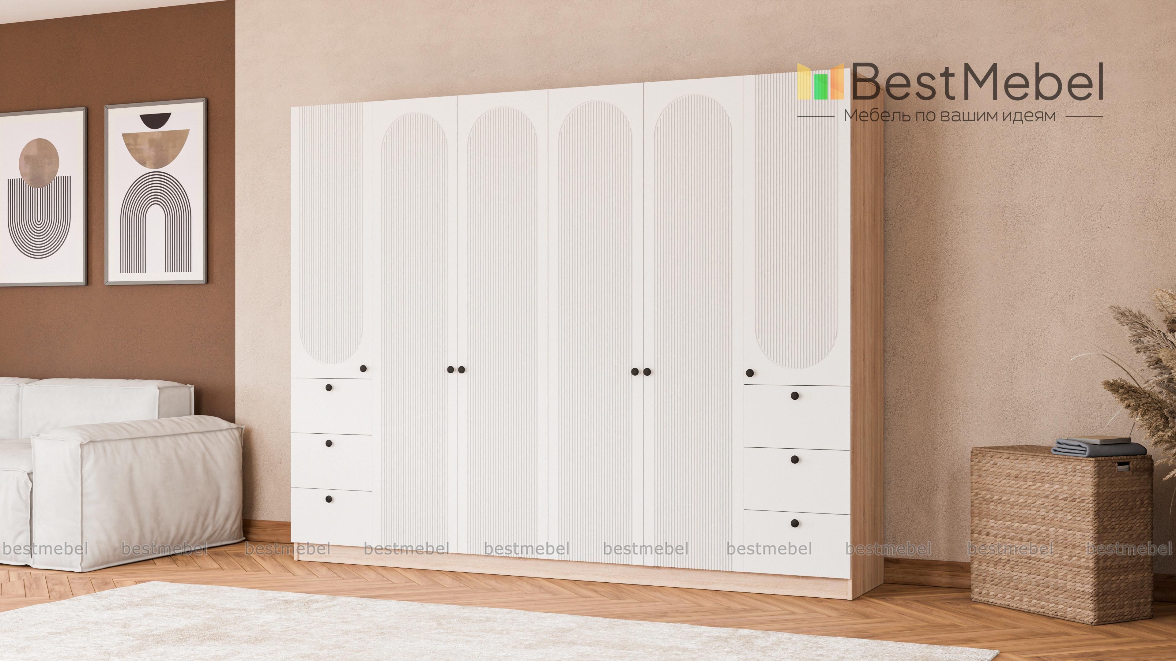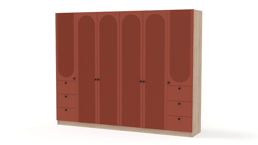 Шкаф распашной Рене 33 BMS объединил два платяных отделения в центре и две расположенные по бокам однодверные секции с ящиками. Большое количество мест для хранения позволяет компактно разместить гардероб, мелкие аксессуары и постельные принадлежности. Фасад шкафа украшен геометричным рельефом, на дверцы и ящики установлены удобные круглые ручки. Купить шкаф распашной Рене 33 BMS, изготовленный по индивидуальным размерам, вы сможете на сайте нашего интернет-магазина.