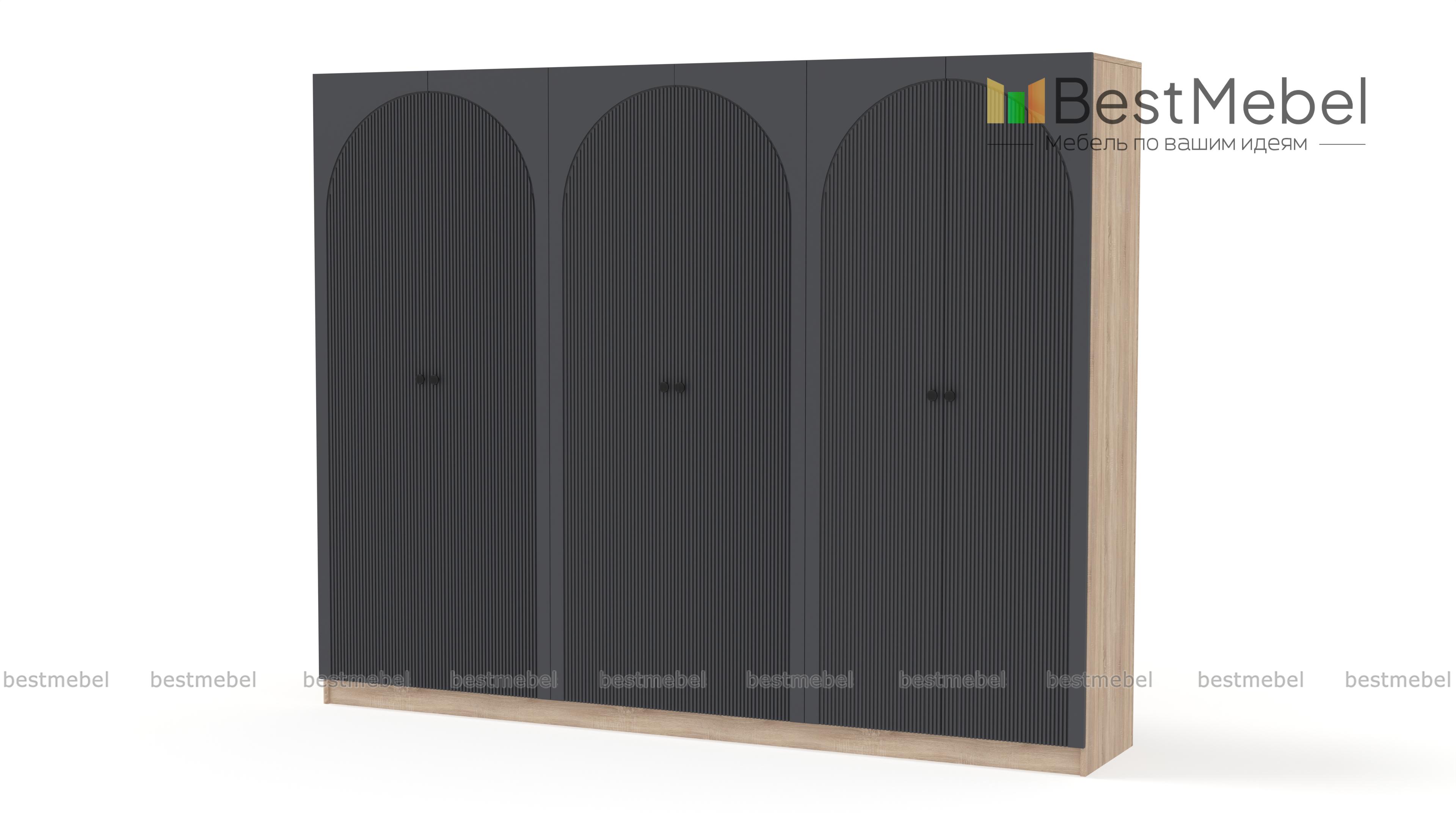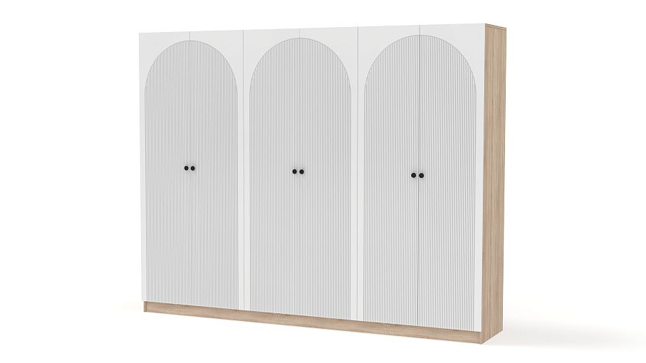Шкаф распашной Вивьен 16 BMS — это удобный и вместительный гардероб с современным дизайном. Шестидверная конструкция включает в себя все необходимое для хранения одежды, обуви, аксессуаров и постельных принадлежностей. Фасады, изготовленные из МДФ с рифленым рисунком, стильно выглядят, просты в уходе и долговечны, корпус — ЛДСП высокого качества. Купить шкаф распашной Вивьен 16 BMS с выбором размеров, цвета и компоновки вы сможете недорого в нашем интернет-магазине.