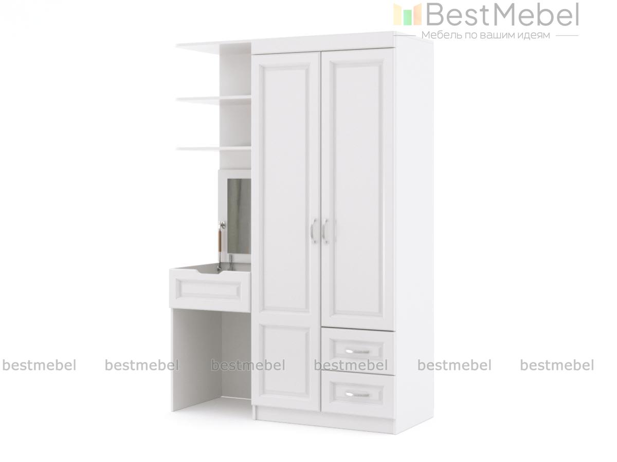 Шкаф со столом Лея 6 BMS поможет значительно сэкономить пространство и сделает небольшую комнату визуально просторнее и светлее. Двухдверный платяной шкаф с выдвижными ящиками в основании дополнен торцевыми открытыми полками для книг, предметов декора и бытовых мелочей, туалетным столиком с откидной столешницей и отсеком для уходовых средств и банкеткой. Белоснежные фасады декорированы рамочной фрезеровкой. Купить шкаф со столом Лея 6 BMS приглашаем выгодно в наш интернет-магазин.
