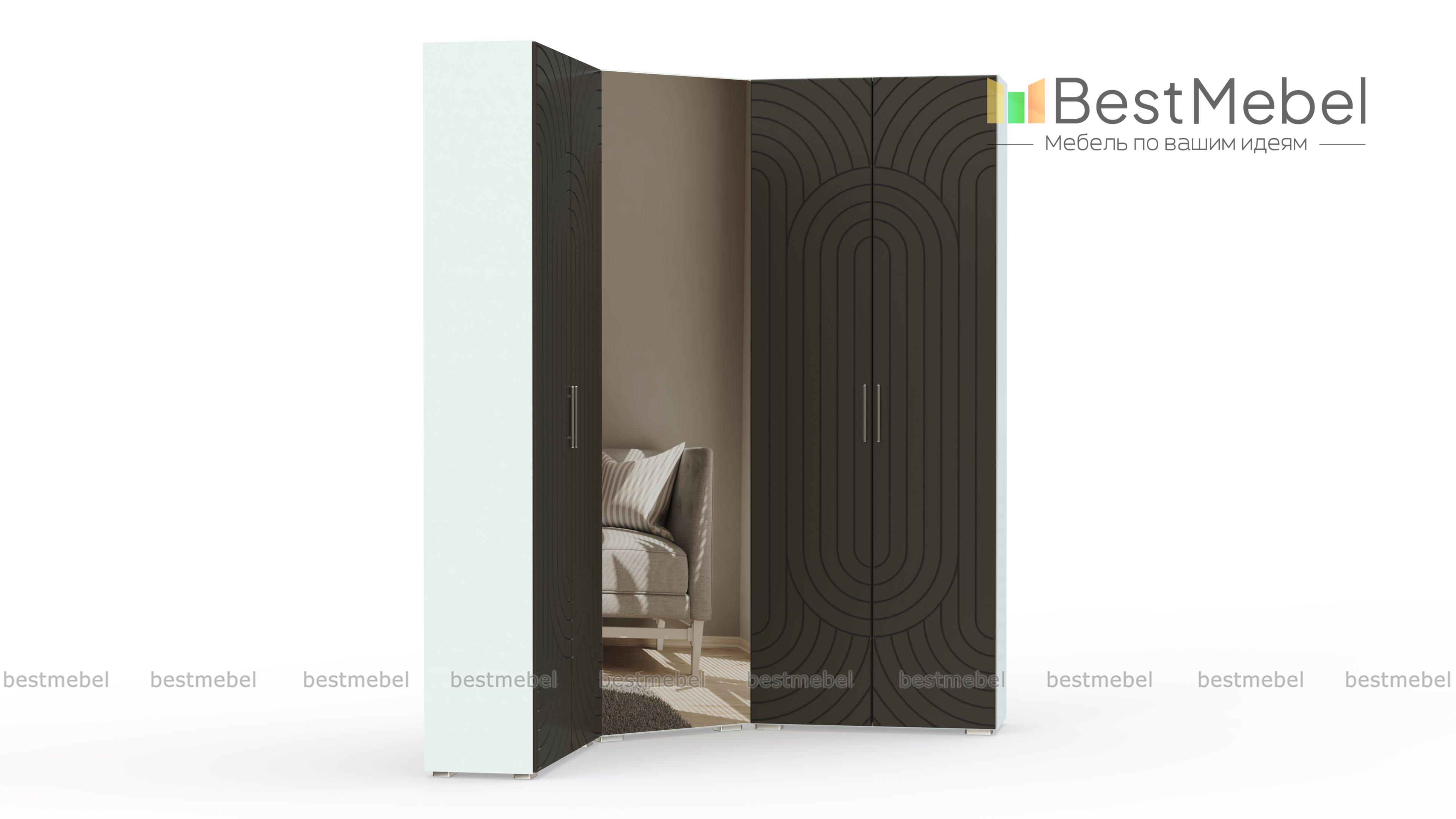 Шкаф угловой Ирис 2 BMS поможет выгодно использовать особенности планировки и нестандартно подойти к организации пространства. Эффектная угловая композиция объединила два двухдверных распашных шкафа с фрезерованными фасадами и однодверный зеркальный в форме трапеции. Вместительные внутренние отделения шкафной группы позволят компактно разместить большое количество вещей – одежды, обуви и аксессуаров. Купить шкаф угловой Ирис 2 BMS приглашаем в наш интернет-магазин с учетом необходимых параметров.