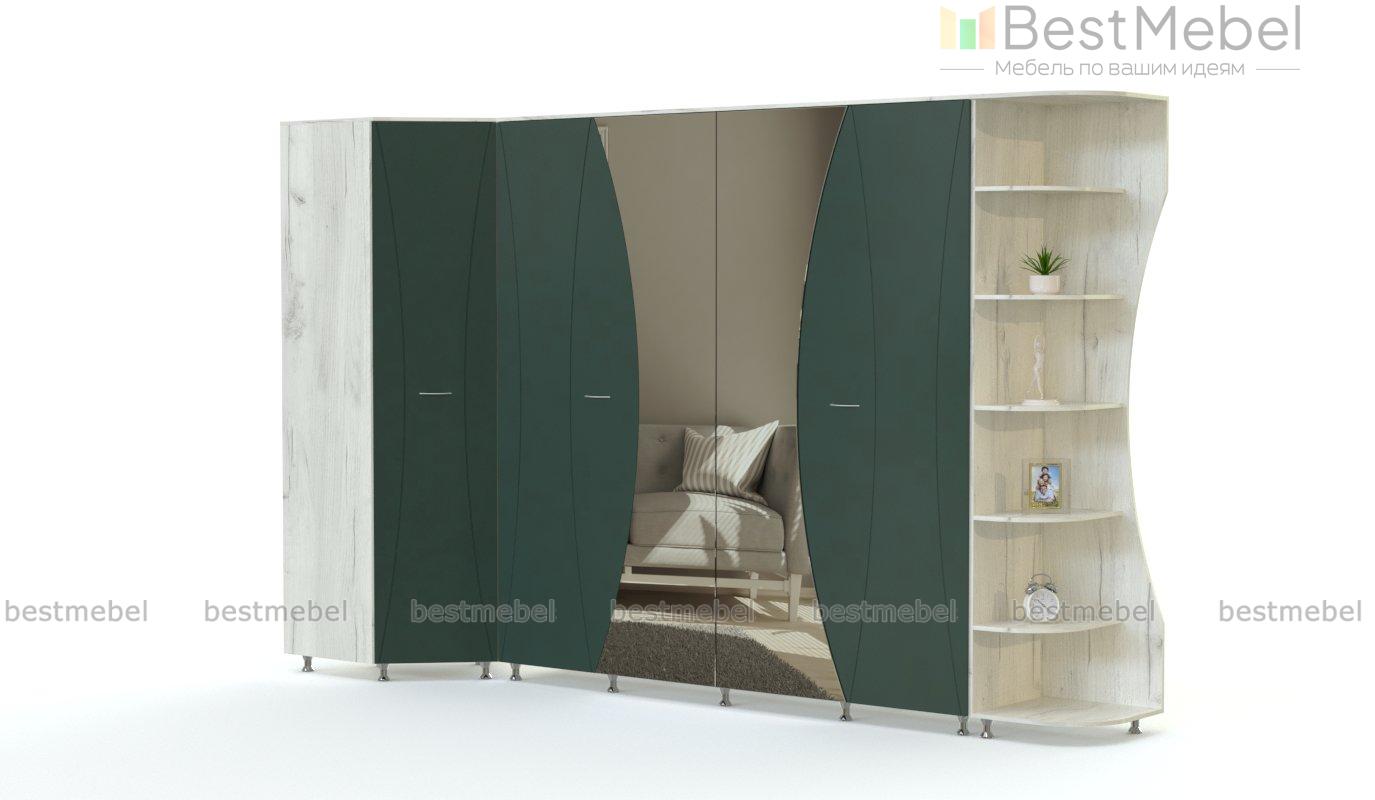Угловой шкаф Луна 8 BMS эффектно сочетает в оформлении теплые крафтовые тона и белый с зеркальными полотнами. Декорированный фрезеровкой и полукруглыми вырезами, шкаф станет настоящим украшением современного спального интерьера. Композиция Г-образной формы включает в себя угловой однодверный модуль, четырехдверный шкаф и торцевой стеллаж с открытыми радиусными полками. Купить угловой шкаф Луна 8 BMS и компактно разместить большое количество вещей вам поможет наш интернет-магазин.