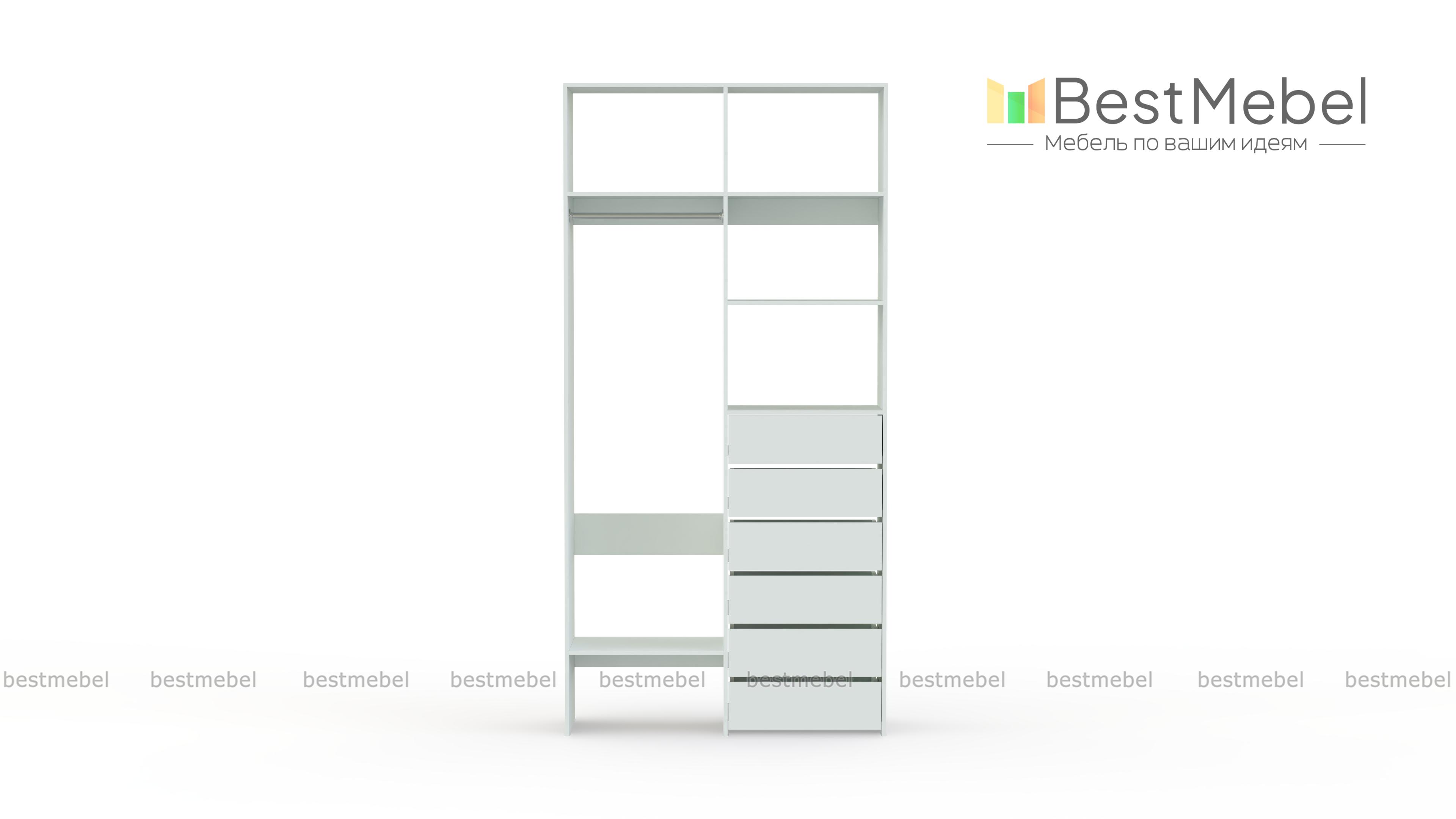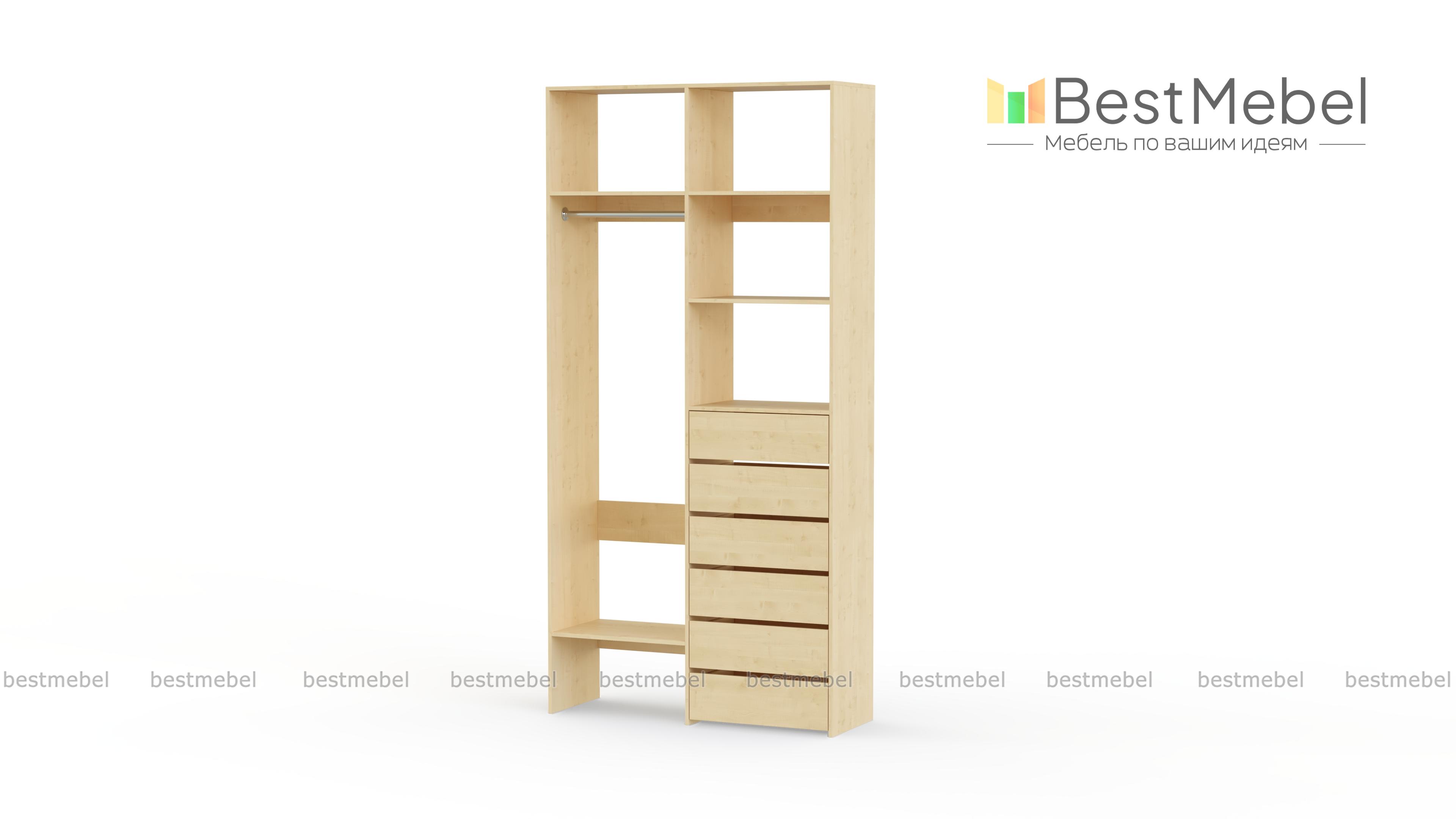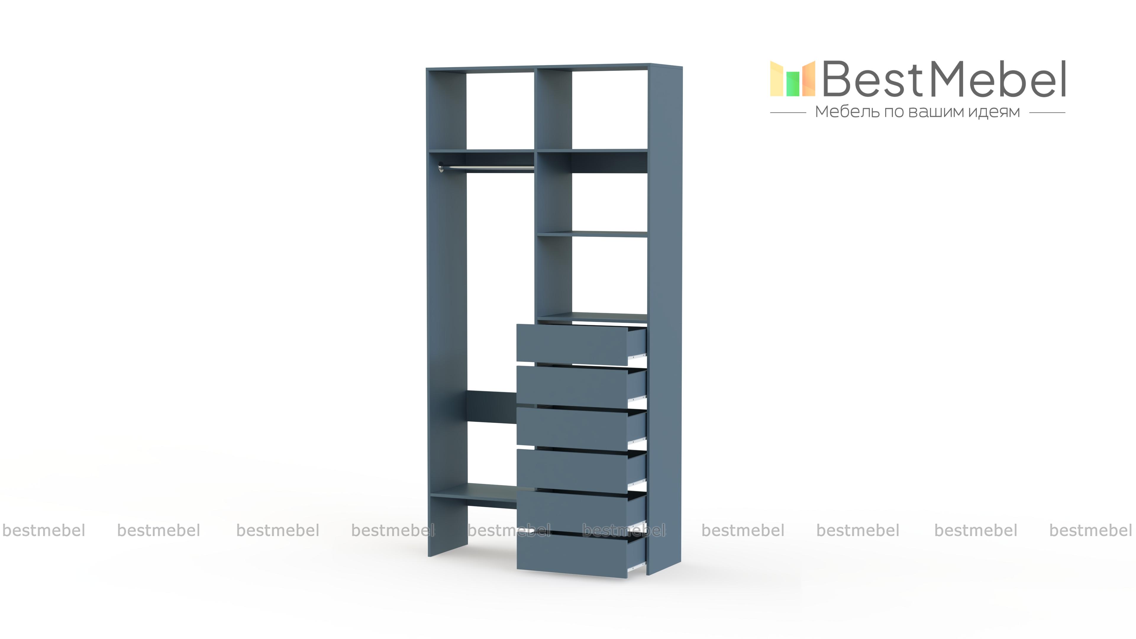 Стеллаж для одежды Мирта 38 BMS включает в себя разноплановые отделения для максимально удобного хранения. Платяное отделение слева и ряд из шести выдвижных ящиков справа дополнены вместительными бельевыми полками. Благодаря изготовлению из ламинированной ДСП стеллаж доступен по цене, прост в уходе и имеет широкую цветовую палитру. Купить стеллаж для одежды Мирта 38 BMS в необходимом вам размере и цвете вы всегда сможете на сайте нашего интернет-магазина.