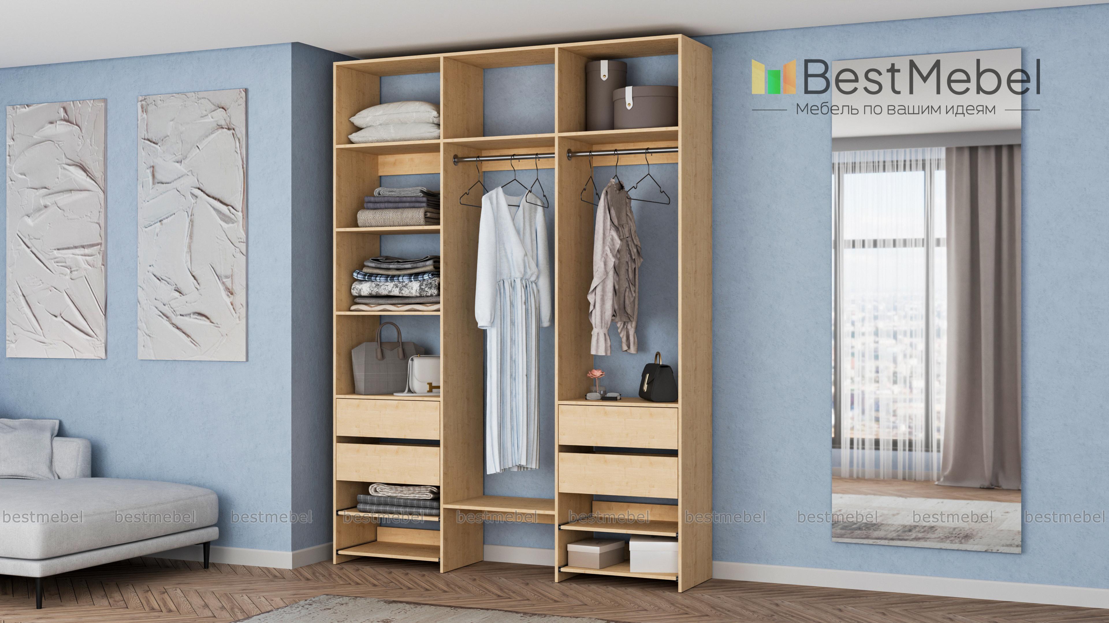 Стеллаж для одежды Мирта 90 BMS станет вашим помощником в сохранении порядка. Компоновка, включающая две штанги, боковые и верхние полки, две пары ящиков и выдвижных панелей, оптимальна для аккуратного размещения одежды на вешалках и в сложенном виде, обуви и мелких аксессуаров. Нейтральный древесный оттенок ламинированной плиты подчеркивает универсальность дизайна. Купить стеллаж для одежды Мирта 90 BMS в прихожую, гардеробную, мастерскую приглашаем в наш интернет-магазин.