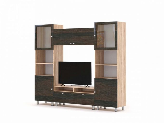 Стенка Кейси 17 BMS – это модульная композиция для небольшой современной гостиной. Широкая низкая тумба с ящиками и нишами под аппаратуру дополнена симметрично расположенными пеналами с витринами и межсекционной распашной полкой. Лаконичная форма предметов в сочетании с компактными размерами и коричнево-бежевая цветовая гамма делают стенку универсальной. Купить стенку Кейси 17 BMS и оригинально оформить зону размещения ТВ вам всегда поможет наш интернет-магазин.